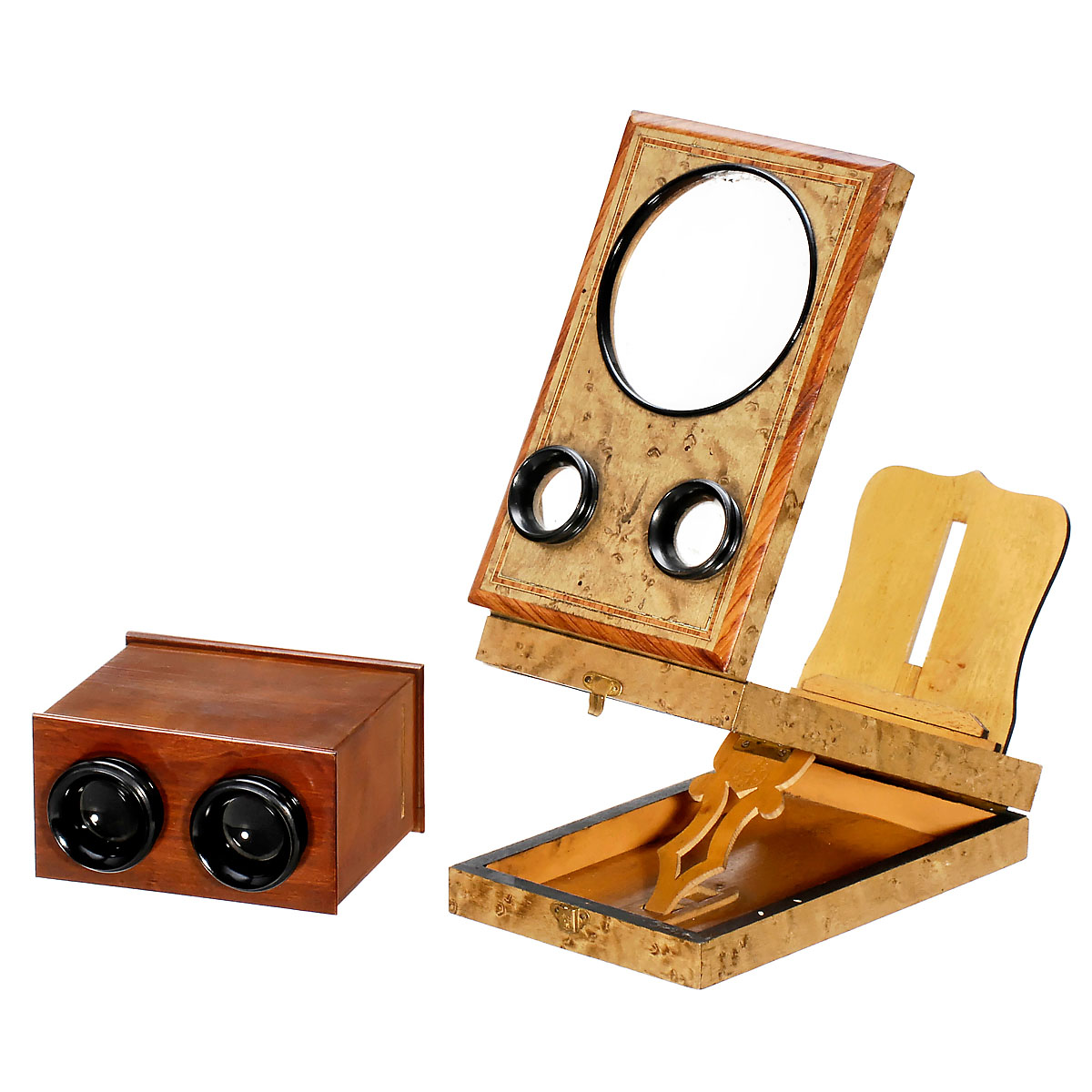 1) French stereo graphoscope, c. 1880, for stereo cards of 6 x 13 cm and cartes-de-visite, magnifying lens Ø 4 in., bur-wood, height open 13 ¾ in. (3–2/2) – And: 2) Hand-held stereo viewer, polished wood, wooden ocular rings, for stereo slides of 45 x 107 mm. (3/3-) – In addition: Box of stereo slides.