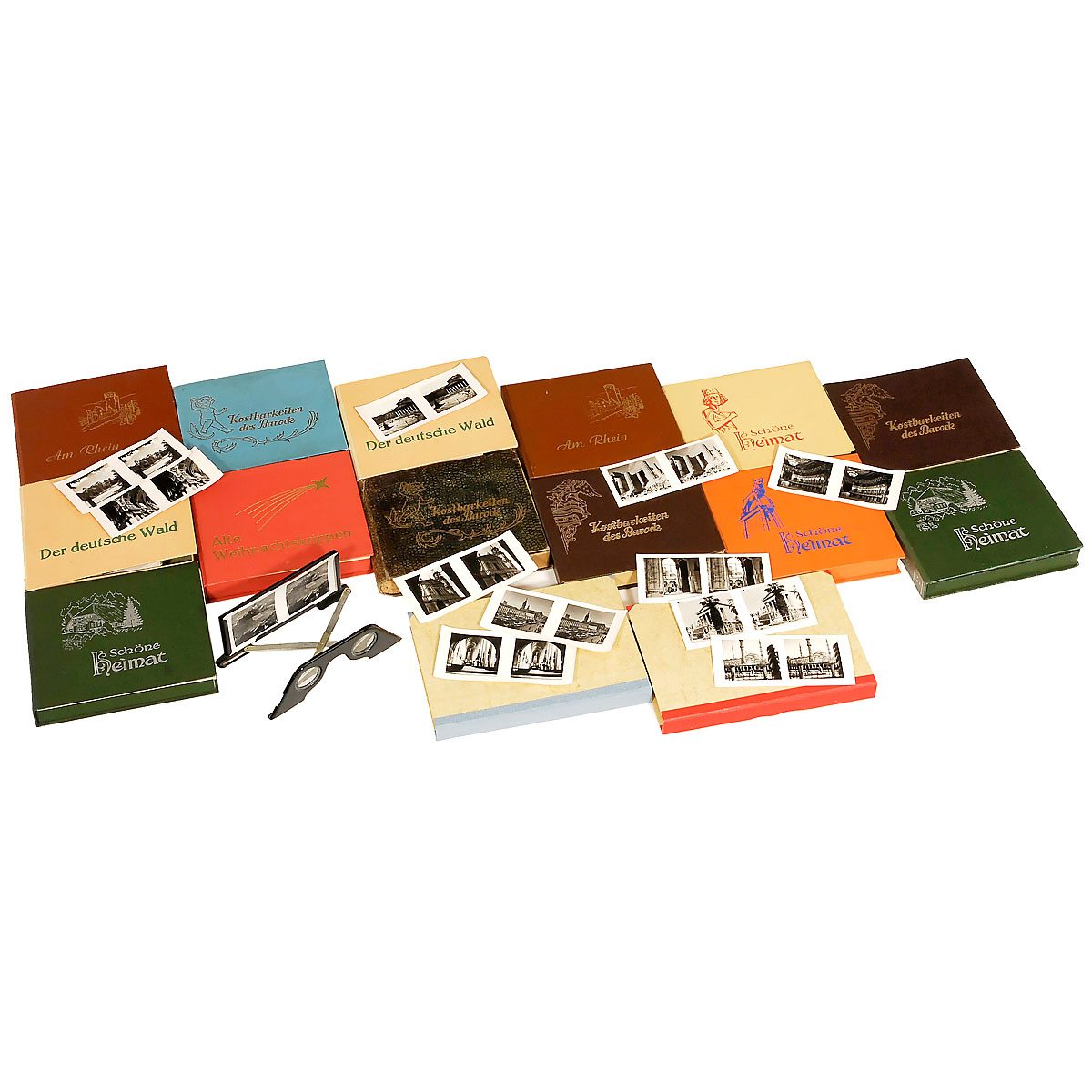 Raumbild-Werkstätte, Otto-Schönstein-Verlag, Oberaudorf. Stereo pictures of 6 x 13 cm. 1–4) 4 x "Kostbarkeiten des Barock", various, with 24 cards each. – 5–6) "Der deutsche Wald", 2 boxes with all in all 150 cards (nos. 1–75 and 76–150). – 7) "Alte Weih nachtskrippen", nos. 1–30. – 8–9) 2 x "Burgen, Dome, Städte am Rhein", 1st and 2nd edition, nos. 1–24. – 10–13) 4 x "Schöne Heimat", various, nos. 1–24 and 1–30. – And: 14–15) 2 x unmarked, inside: "München und Umgebung" and "Mittelmeerraum", card size 6 x 13 cm, box size 14 x 21 cm. – Box size nos. 1–13: 17 x 14 cm, some boxes with stereo viewer.