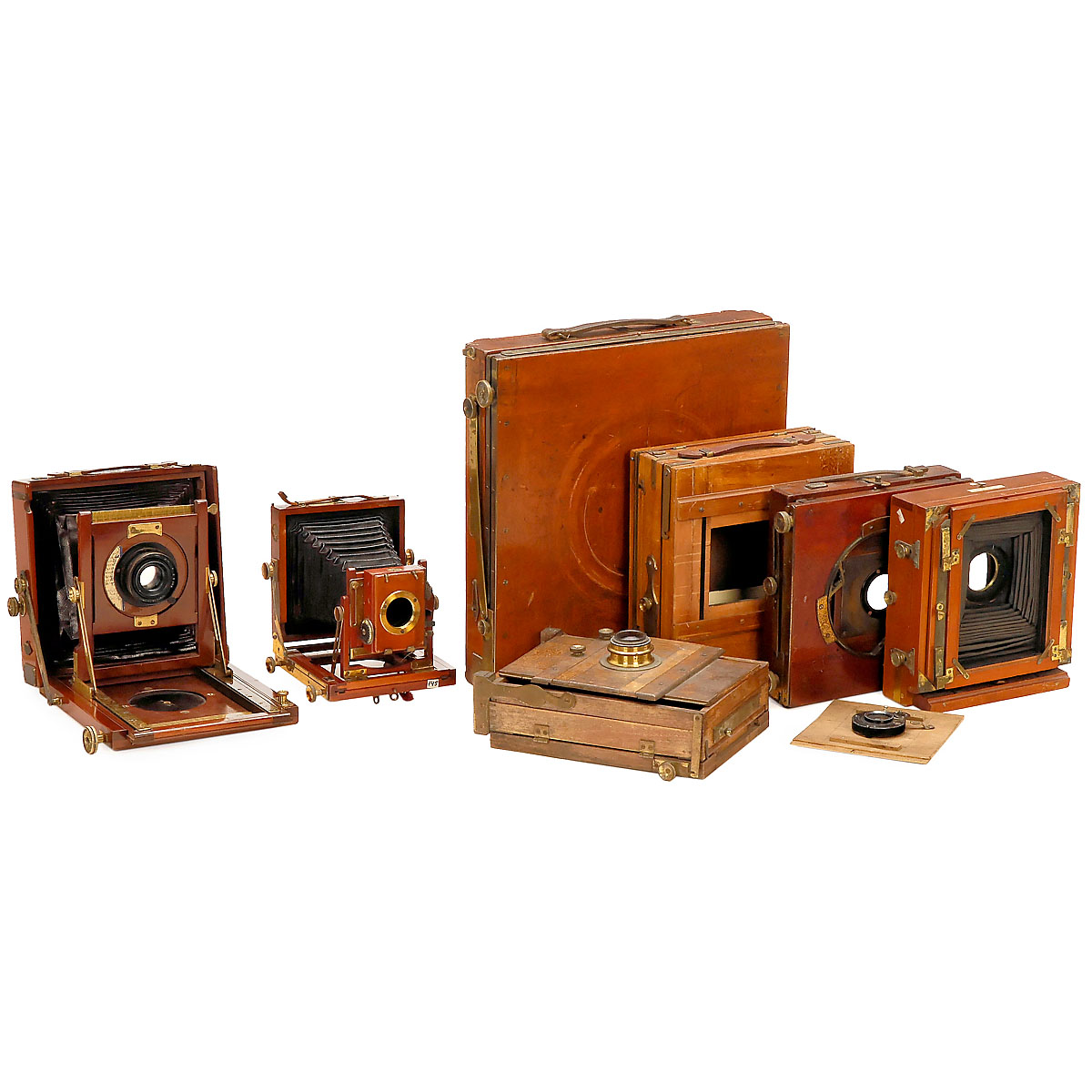 Spare parts. 11 field cameras, various sizes and manufacturers (1 camera with lens), 2 tripods, 8 roller-blind shutters, more than 60 wooden cassettes (various sizes). – Please have a look!