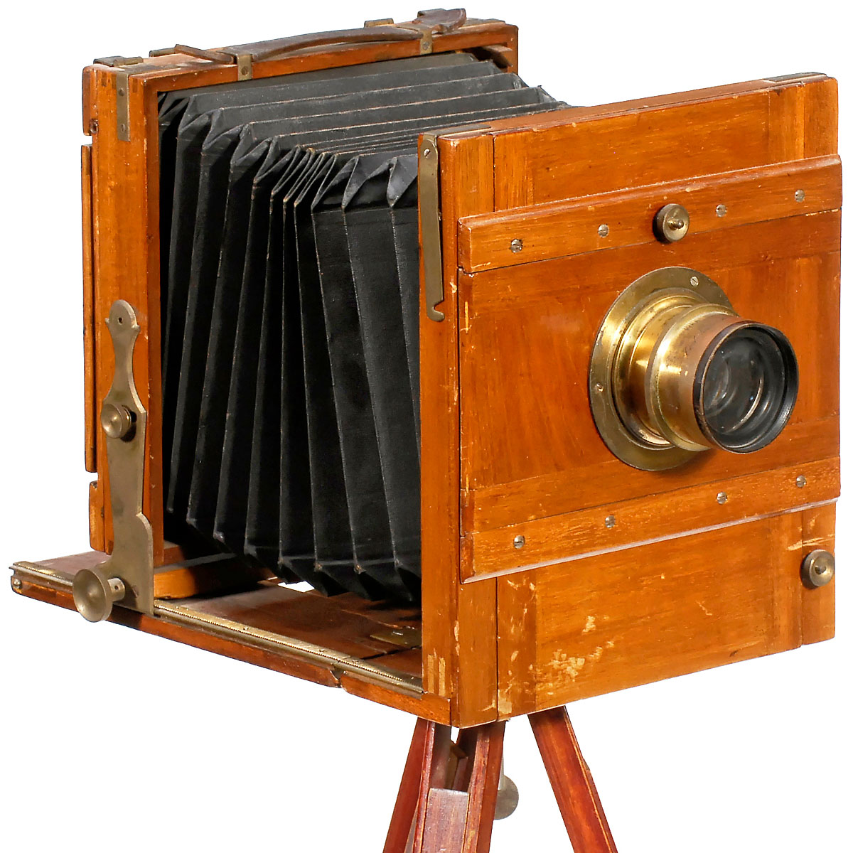 Unmarked. Polished wood with brass fittings, black bellows (with small holes), focusing screen back. With "Carl Zeiss Planar 3,8/160 mm Serie Ia, No. 11", iris stop. – In addition: Wood tripod.