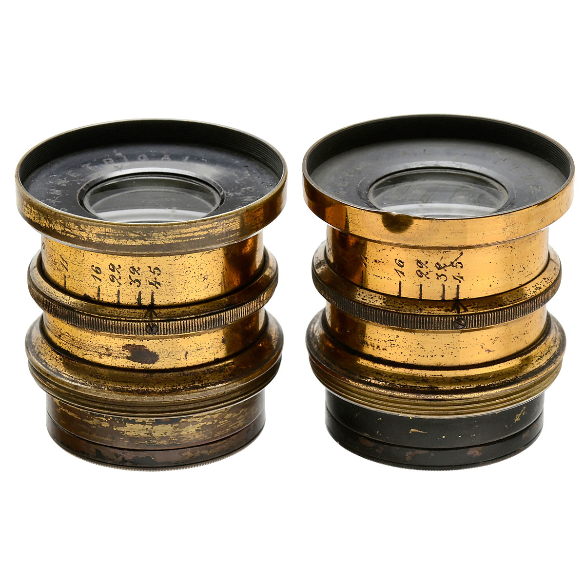 2 "Symmetrical" lenses of approx. 20 cm focal length, iris stop, height 2 in., Ø 2 in.