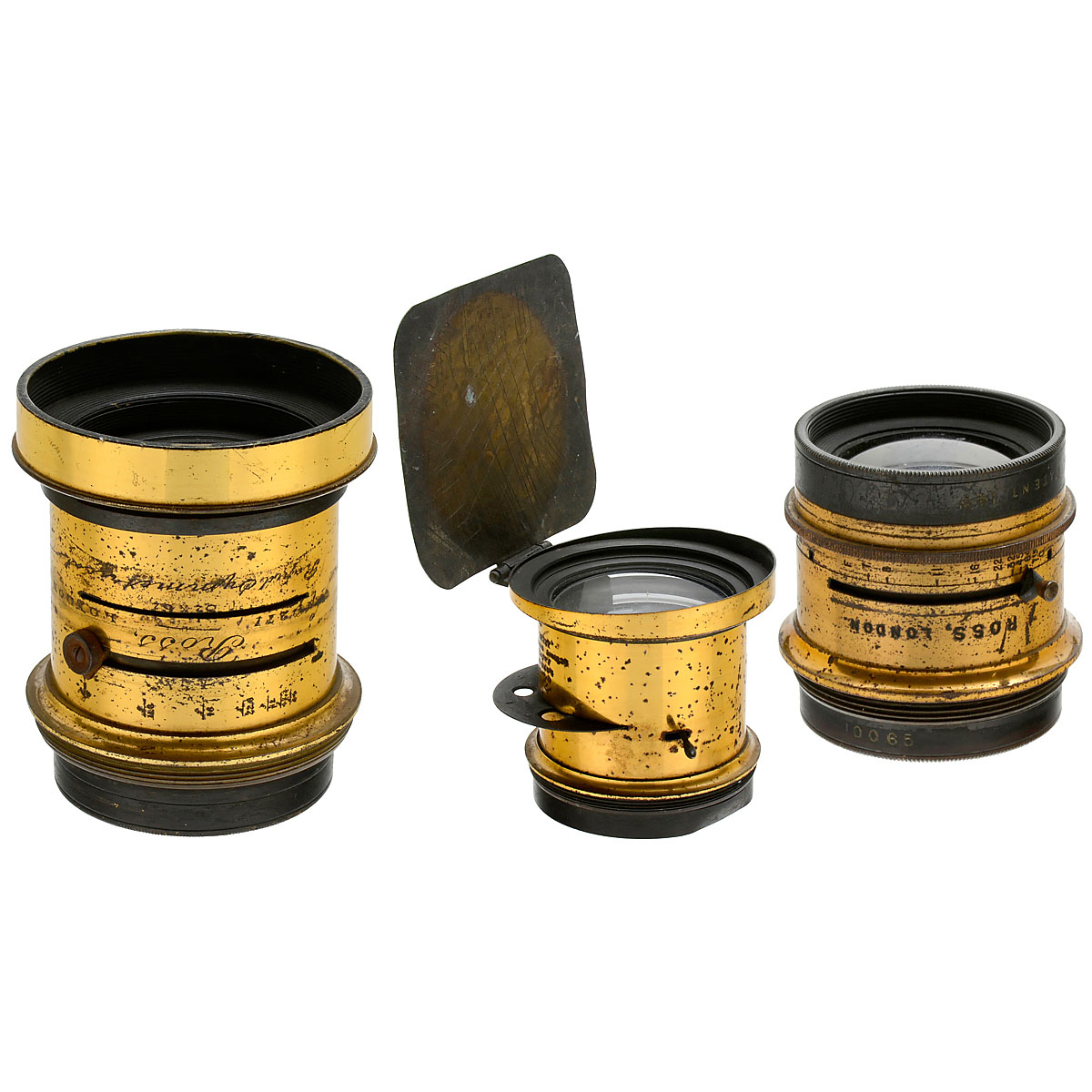 1) Rapid Symmetrical, no. 40271, approx. 30 cm focal length, iris stop and for waterhouse stop, height 3 1/6 in., Ø 2 1/3 in. (3+/3+) – 2) Th. Ross Actinic Doublet, no. 12501, "12 x 10", c. 1864, an unsymmetrical doublet wide-angle lens, the first that was practically free of distortion. – A milestone! – Focal length approx. 25 cm, height 85 mm, rotating stop, lever and swing-out shutter. With dent in lens hood and rear lens mount. (3-/3-) – And: 3) Zeiss Convertible Anastigmat by Ross, c. 1895, based on a development of Dr. Rudolph – the so-called "Anastigmat-Satz-Objektiv", patented in 1890, iris stop, height 2 in. (3+/3)