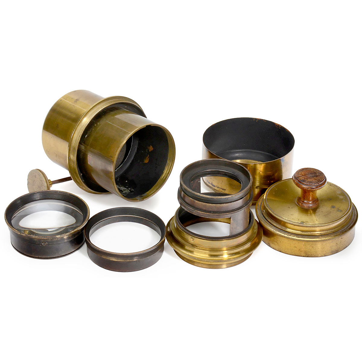 Unnumbered. This "Objectif à foyer multiples et lentilles additionelles" (patented in 1858) is in essence a Petzval-type lens, supplemented with 2 further lenses: one for the extension and the other for the reduction of the focal length. Thus, by using all sorts of lens combination, 6 different possibilities arise: 3 for portraits and 3 for landscapes. Quick change by bayonet (!) instead of screw! Washer stops. Rack-and-pinion is working. Only one of the two additional lenses is available, washer stop is a provisional replacement. Height approx. 21 cm, front lens Ø approx. 70 mm. With attractive wood-handled lens cap. An outstanding piece!