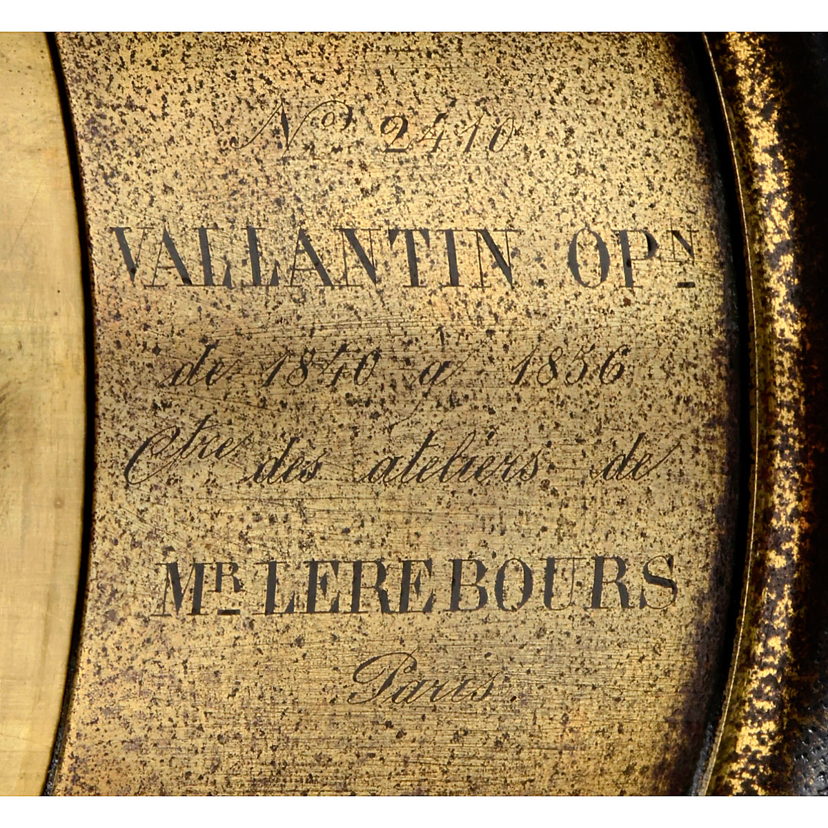 No. 2410. With an interesting engraving: "Vallantin Opn de 1840 a 1856 C.t des Ateliers de Mr Lerebours Paris". Focal length: approx. 38 cm, height: (pulled out) approx. 130 mm, lens: Ø approx. 80 mm. Washer stops, draw tube focusing. With lens connecting ring. Vallentin is thought to have produced around 3376 lenses. His connection to Lerebours strengthens Vallentin's already good reputation. – Literature: Corrado D'Agostini, "Photographic Lenses of the 1800s in France".