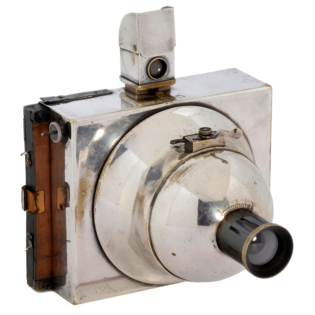 Compagnie Française de Photographie, Paris. No. 1922, plate size 9 x 12 cm, chrome-plated version, 5 spring-set shutter speeds, working, 2 double cassettes, with original viewfinder and original case. – Rare classic camera!