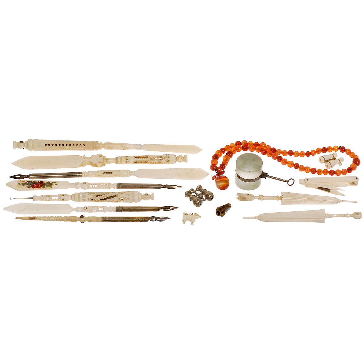4 paper knives, 4 stylographs, 2 umbrellas, crochet hook, necklace with pendant, miniature binoculars and rare large Georgian-style hand-held botanical stanhope field magnifier. – In addition: Micro picture of "Her Majesty the Queen" and family by J.H. Steward.