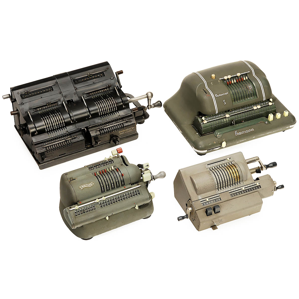1) Sought-after duplex model for special calculating processes. (2-/2) - 2) "Hamann Automat S", c. 1958. Electric 4-species machine. (2-/-) - 3-4) "Original Odhner Mod. 207". (3/2) - And: 5) "Walther WSG 160". (2/3)