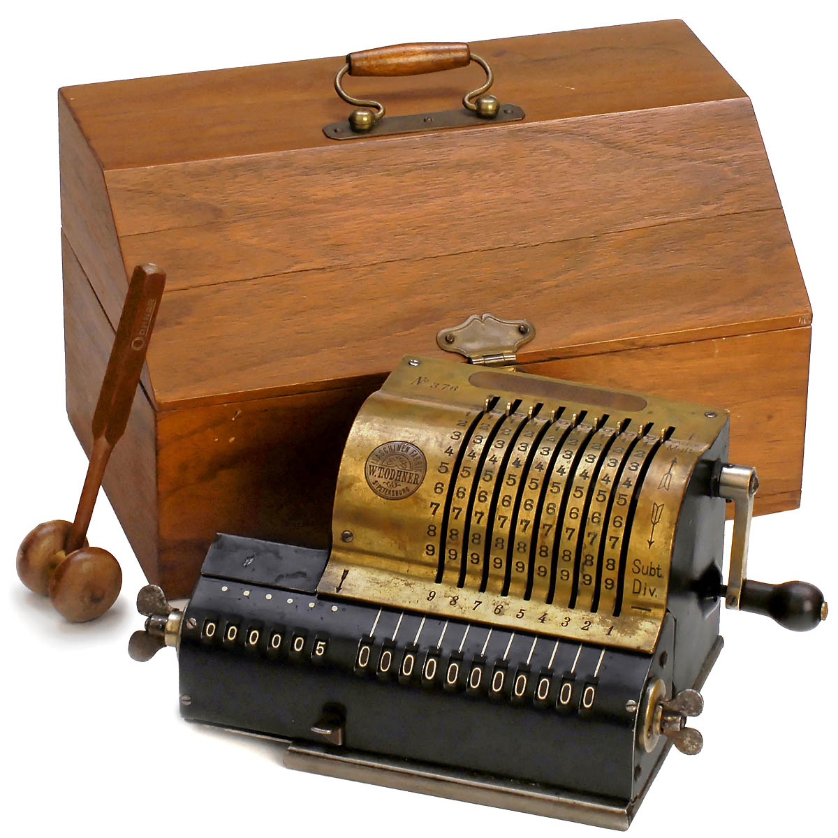 One of the very few known 1st models of the original Odhner no. 1 "Arithmometer" made in St. Petersburg, Russia by Swedish pioneer Willgodt T. Odhner. Low serial no. 376! With original wood case and rare advertising hammer. - A giant milestone in calculating history.