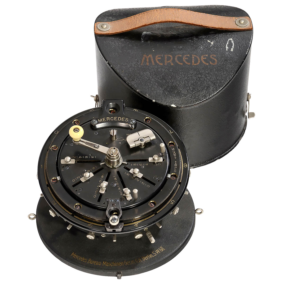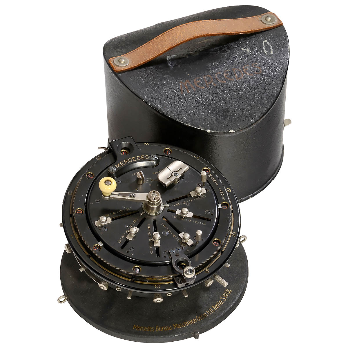 Named after one of the most important mathematicians ever: the German Carl Friedrich Gauss. - Sensationally rare stepped-disc calculating machine for all 4 fundamental rules of arithmetic. With indirect subtraction. Designed by renowned German engineer Christel Hamann, Berlin. Made by the Mercedes-Bureau-Maschinen Ges. mbH, Berlin, S.W. 68. German patent 194527 from 23 March 1905. - Low serial no. 1651. With original cover! - This rare machine has only appeared a single time at auction, in our sale of 2007. - A giant rarity and a terrific milestone in calculating history!
