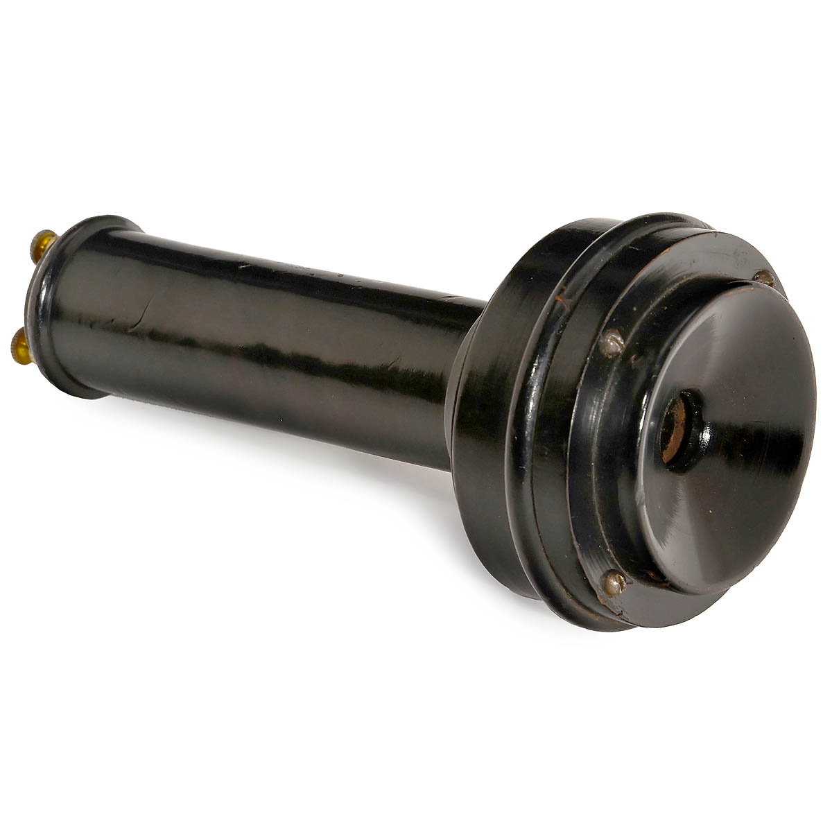 Unmarked, butterstamp telephone, ebonized wood, for speaking and listening, with horseshoe magnet, height 6 ½ in.