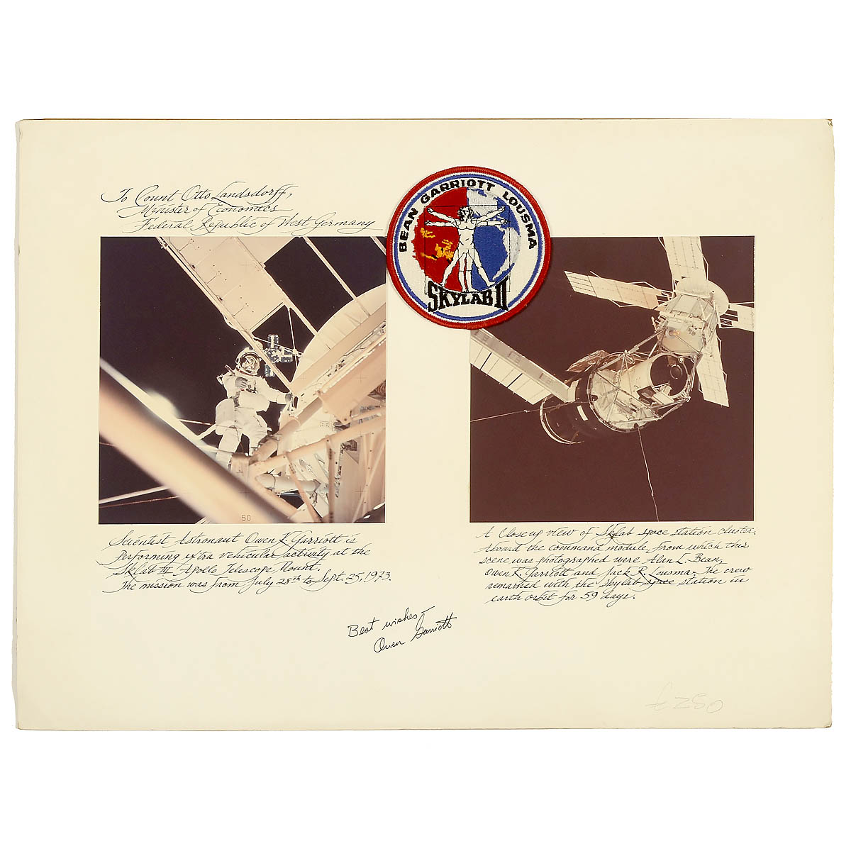 Handwritten document, signed by the US NASA astronaut Owen Kay Garriott and with dedication to Count Otto Lambsdorff (1926-2009). Adorned with 2 original NASA photo-prints and a Skylab insignia. Size 19 5/8 x 15 in.