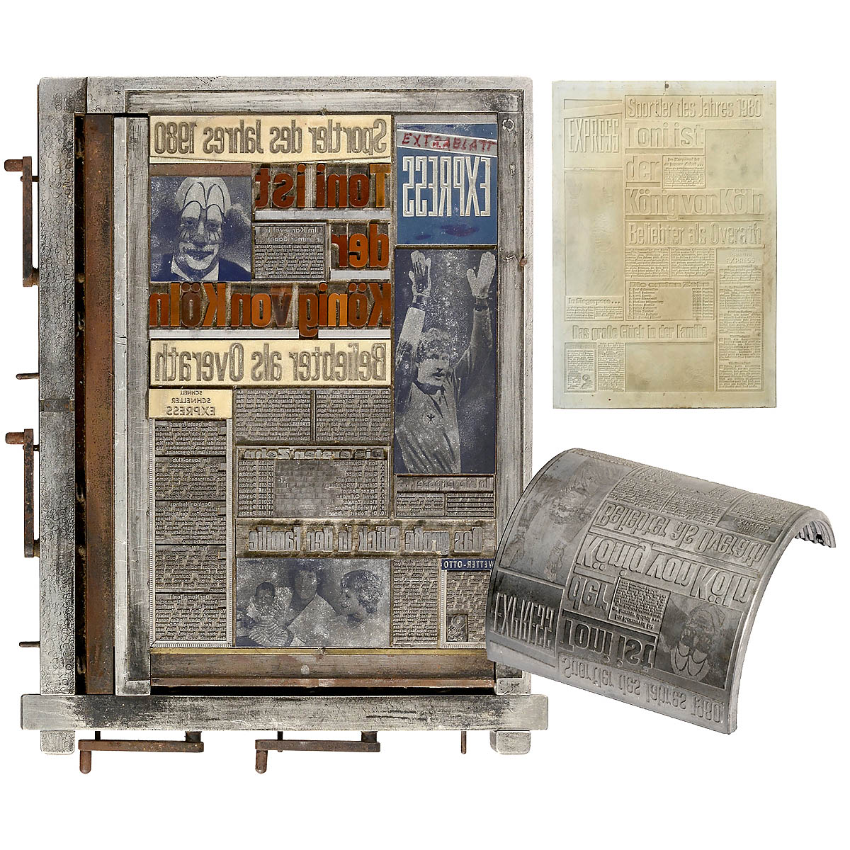 Lead printing block from the final typeset issue of the "Express" before the introduction of film setting. Included are two additional stages in the production line: the paper board matrix and the cylindrical casting for the rotary printing press. - A very special document of technical and regional interest for the City of Cologne and its legendary sports.