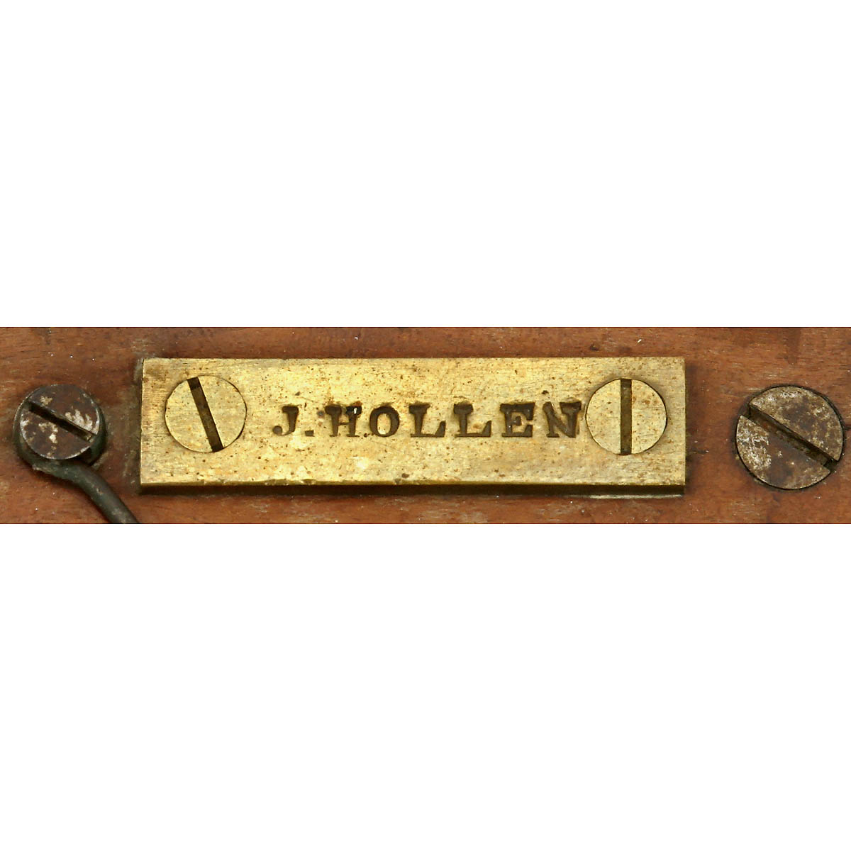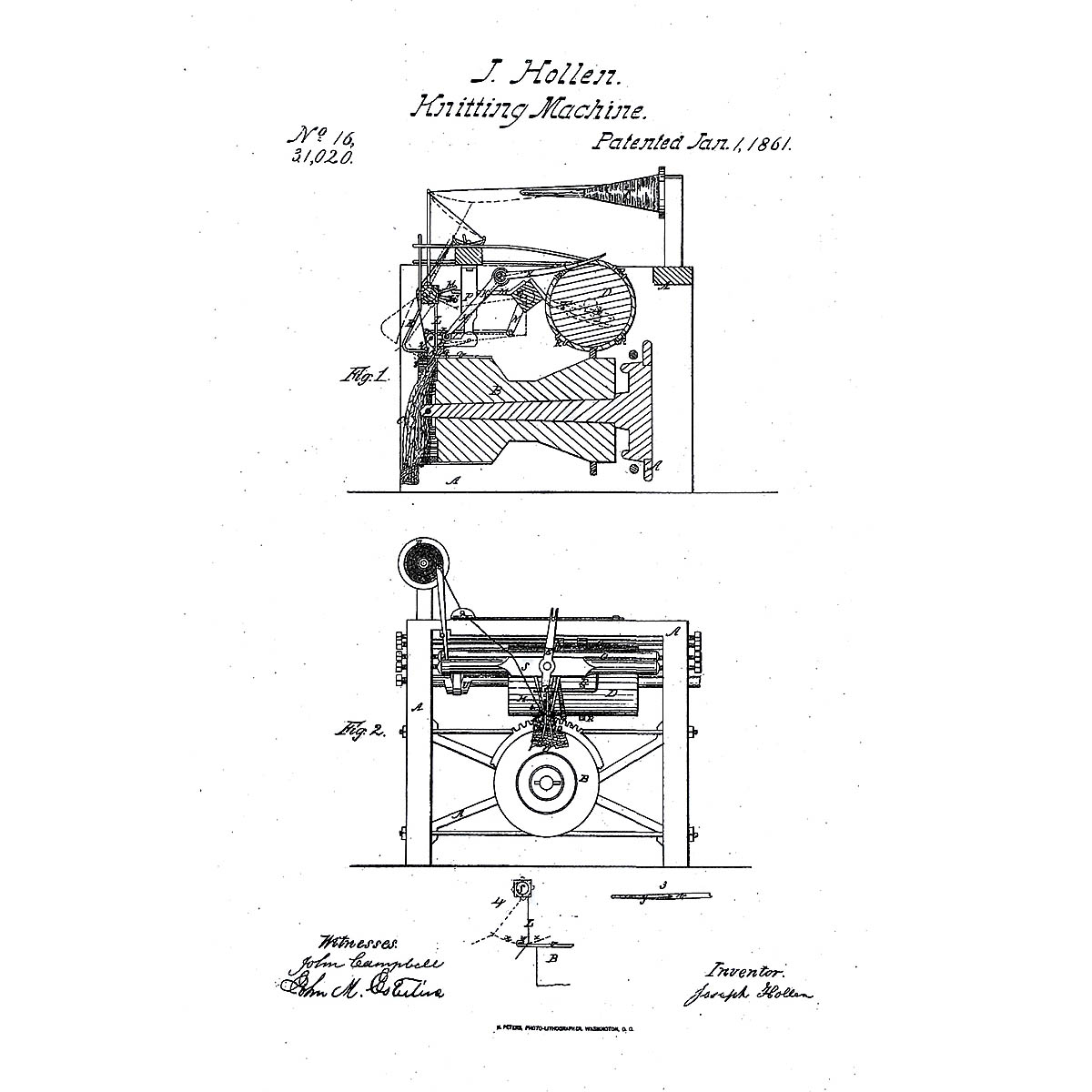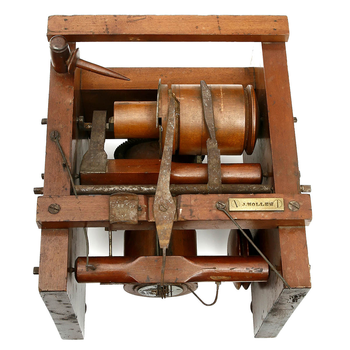 Fostoria (Blair County), Pennsylvania, patented 1. January 1861, No. 31020, with two cherry wood rollers: one grooved and pinned, the other with five steel needles held in place by metal loops, an adjustable thread-carrier set into the upper frame, with brass plaque engraved "J. Hollen" and original patent tag, ht. 9 x wd. 11 ½ x dp. 9 ½ in. The "Journal of the Franklin Institute", July 1831, records an earlier patent for a similar machine submitted by John McMullin and Joseph Hollen Jr. Though the machine manifested "an uncommon degree of ingenuity on the part of the inventor", the author notes that he did not "believe the machine will ever come into general use" (p. 10). The example offered here represents an improvement on a patent granted to Joseph Hollen, proprietor of the successful Hollen Knitting Machine Co., in October 1859. His description notes: "It consists in the peculiar construction and arrangement of devices, as hereinafter described and specified, for lifting the stitches off of hooked needles and giving the required periodical rotary motions to the needle cylinder." The machine consists of a needle cylinder, a presser and a thread-carrier which are vibrated by a cam-operated roller. A rare and early working patent model, in excellent original condition.