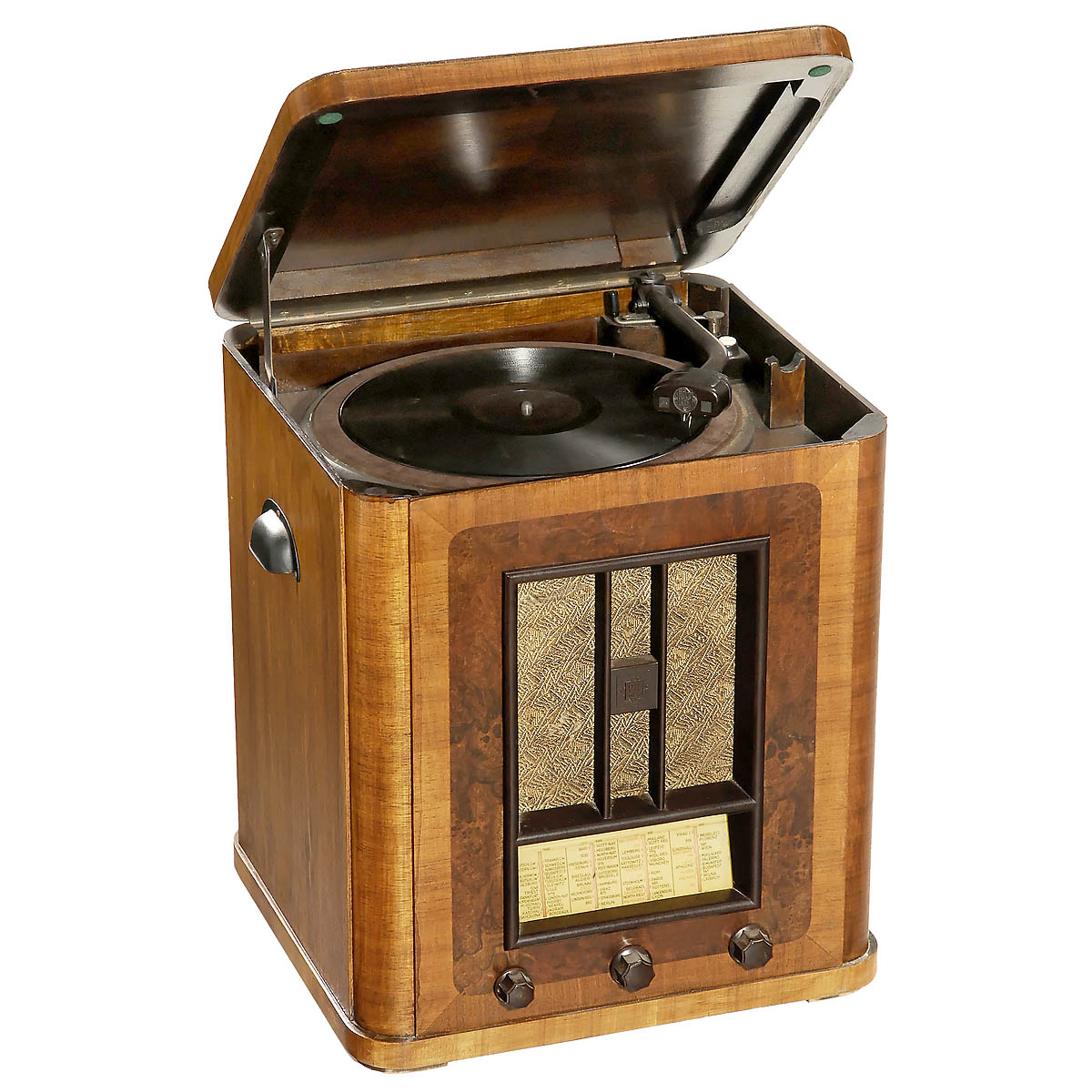 Radio and record player, 4 tubes, LW + MW, alternating current 110-240 V, electro-dynamic loudspeaker, good original condition, handles added.