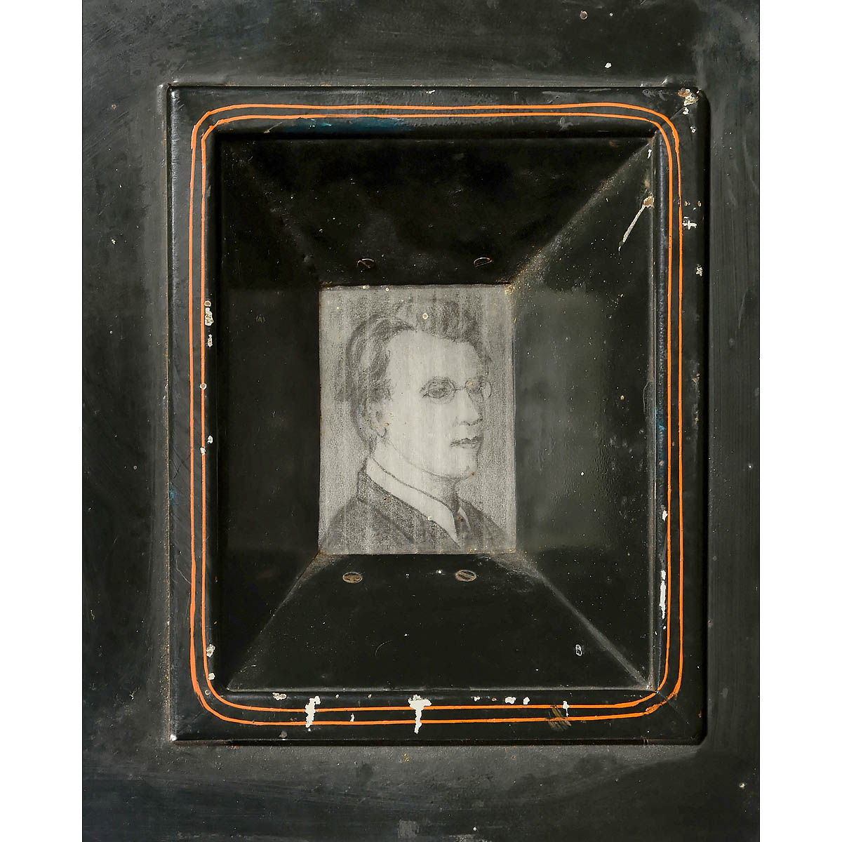 Based on the Plessey design, No. 5 (marked in chalk on interior), with green-painted metal case in well-preserved original finish, red pinstriped decoration, plaster-filled celluloid "Eye of the World" plaque with rotating knob, 2 x 3 in. (5 x 7,5 cm) scr
