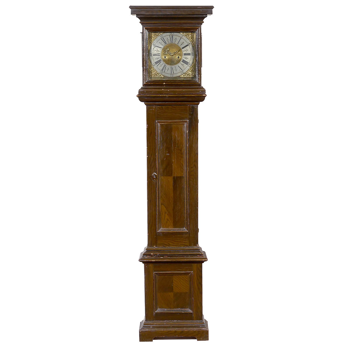Oak-painted softwood case with fielded panels, pewter dial, brass frame, 2-train 8-day movement, hour strike on bell, height 85 in., working (not guaranteed).