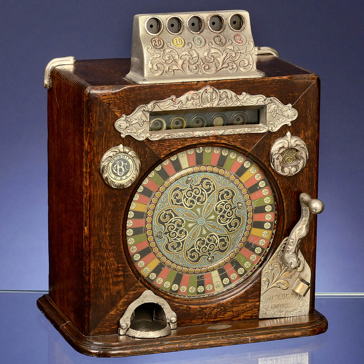 Very sought-after American gambling machine. manufactured by Caille Bros, Detroit, for the Italian market, with cast operator plaque "Giov. Locatelli, Genova", oak case with 5 coin slots, nickeled brass fittings, central wheel, mechanical operation with coin payout, very good and fully working condition. - Literature: 1) Costa, "Automatic Pleasure", p. 206. - 2) Rubin, "Drop Coin Here", p. 30. - 3) Bueschel, "Lemons, Cherries and Bell-Fruit-Gum", p. 59. - A most attractive and rare table model in original condition! With tokens, locks and keys.
