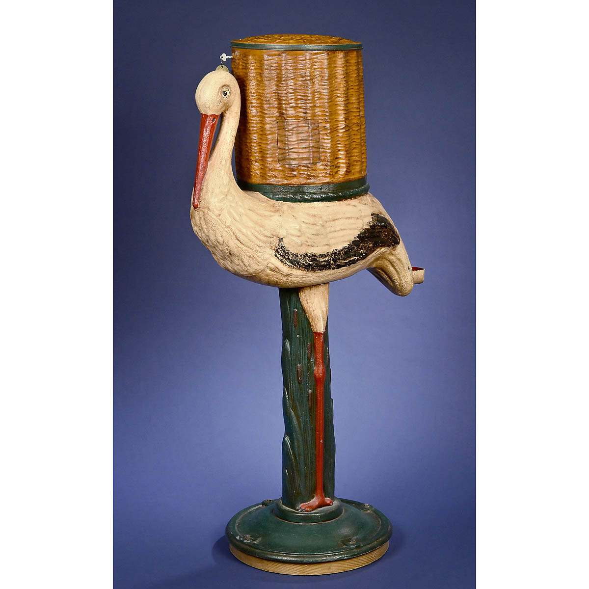 No. 741. MUM-Automaten GmbH, Niedersedlitz, Saxony. German vendor for chocolate dolls in lithographed tins, coin-slot for 10 RPf., put in a coin and turn the crank, the stork makes a sound like "MAAAA” when delivering a tin to the customer, cast-iron base, tin body, height 55 in. Complete with mechanism, lock and key, working. A great figural machine, one of only about 10 known worldwide!!