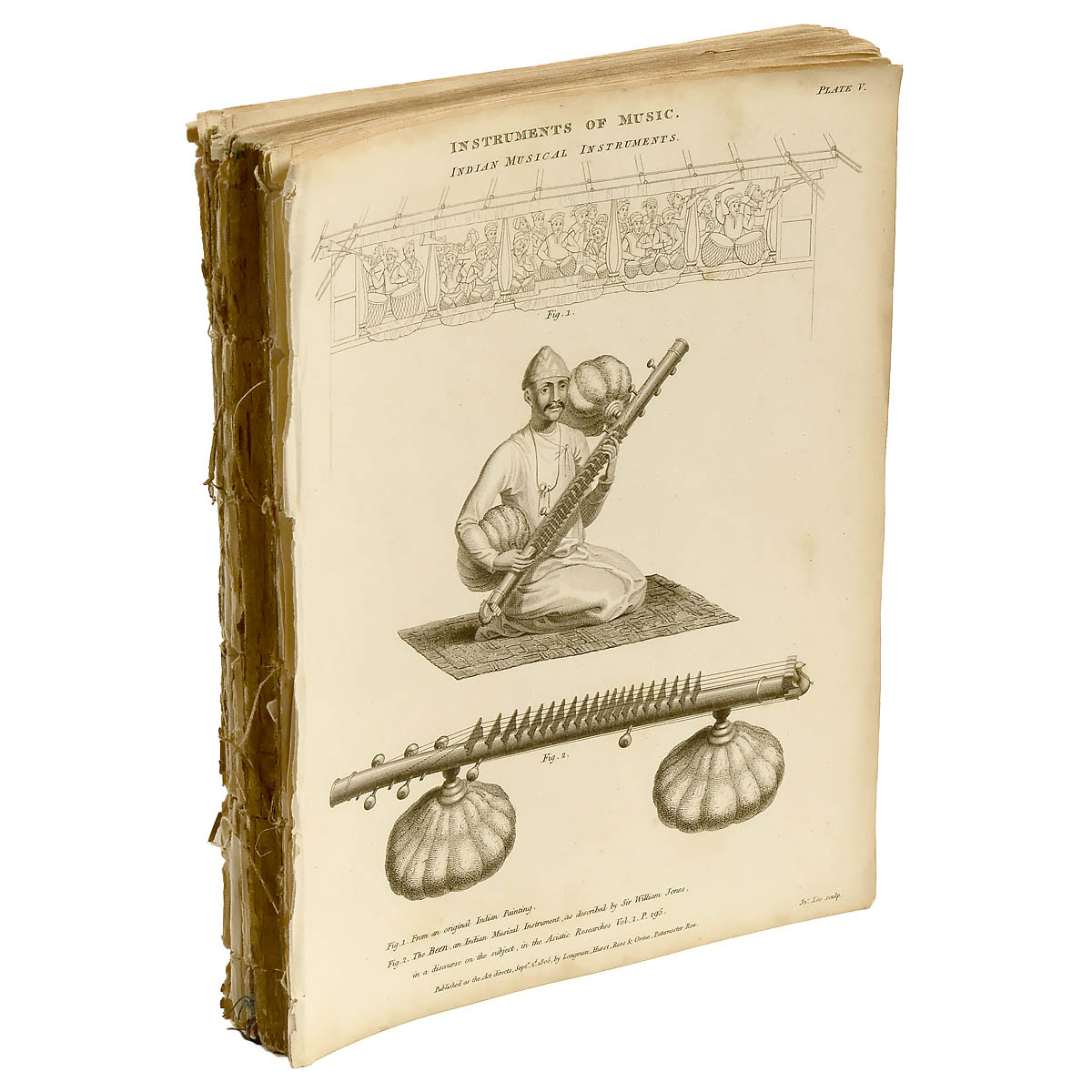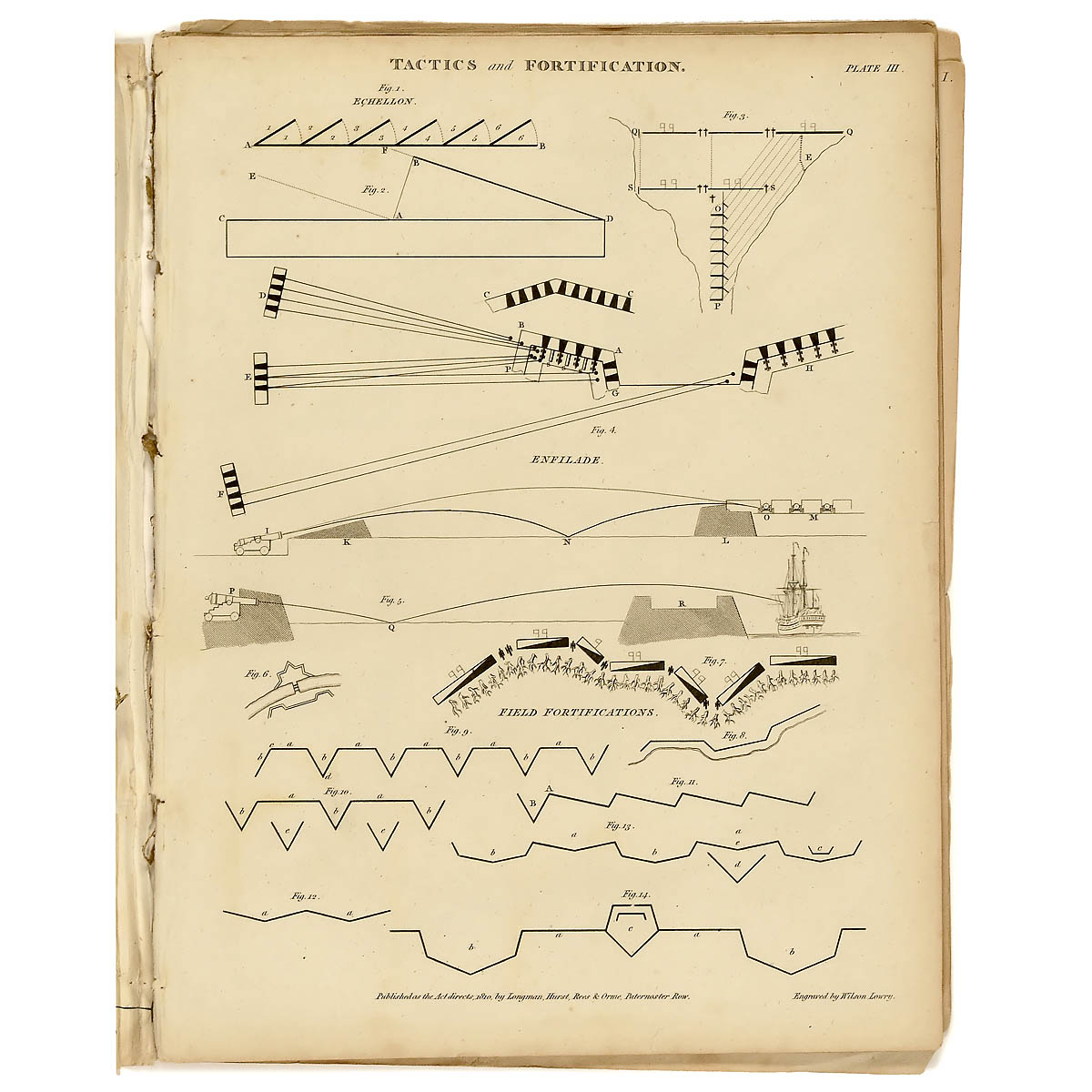 Published Dec. 1806 by Longman, Hurst, Rees & Orme, Paternoster Row, London. Engraved plates illustrating musicians, stringed and wind instruments, including three of organ-building and one titled "Organ Made by Messrs. Flight and Robson for the Earl of Kirkwall". - In addition: Musical scores, plates on military maneuvers, monograms, cipher and other subjects. - Binding loose, foxing.
