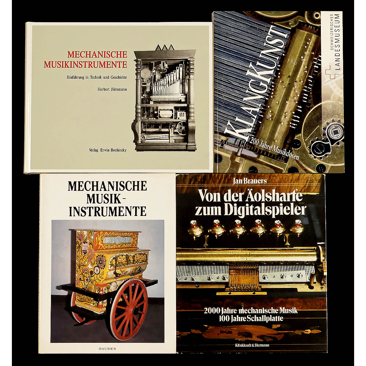 1) Herbert Jüttemann, "Mechanische Musikinstrumente, Einführung in Technik und Geschichte", Frankfurt am Main, Verlag Erwin Bochinsky, 1987, 344 pp., with numerous illustrations and technical drawings, in slipcase. - 2) Eduard C. Saluz, "Klangkunst, 200 Jahre Musikdosen", special exhibition of the Swiss National Museum, Switzerland 1996, 246 pp. - 3) Alexander Buchner, "Mechanische Musik-Instrumente", Prague 1992, 244 pp., with cover. - And: 4) Jan Brauers, "Von der Äolsharfe zum Digitalspieler", Klinkhardt & Biermann, Munich 1984, 280 pp., 210 illustrations, with cover.