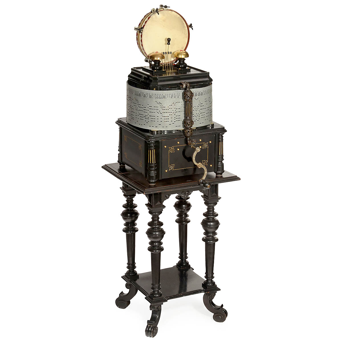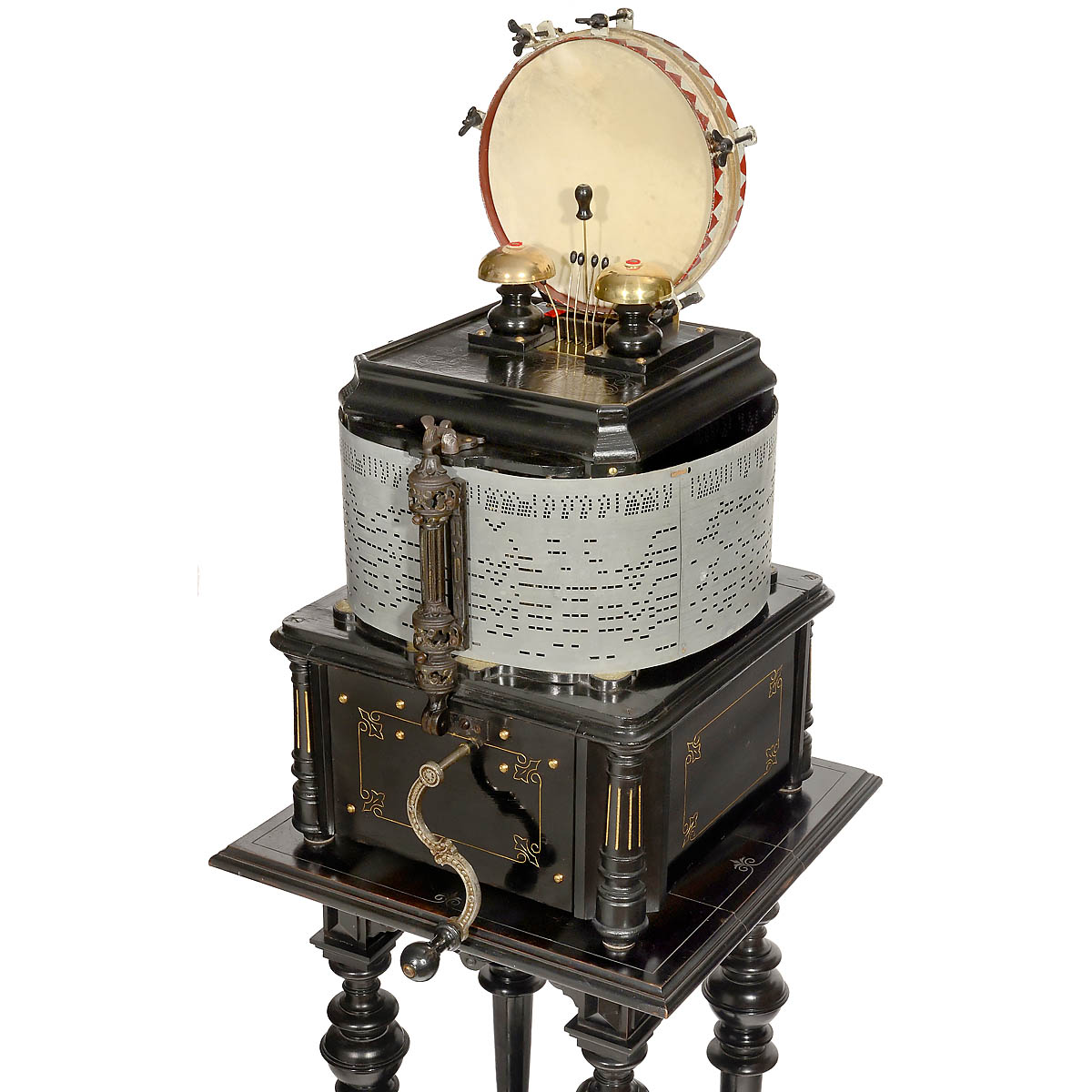 Manufactured by Ernst Erich Liebmann, Gera, Germany. Crank-driven table organ, 42 notes, 36 double reeds including three contrabass reeds, 2 bell-strikers and 4 drum-beaters, on matching table from the same period, excellent playing condition, with 10 metal music sheets. Extremely rare!