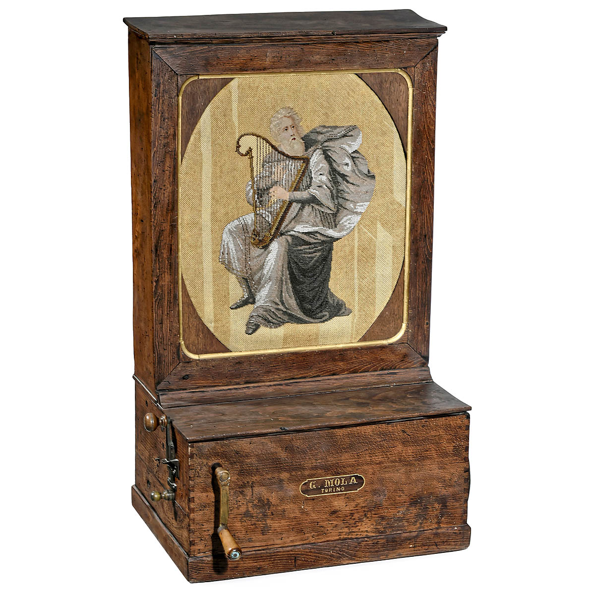 G. Mola, Turin: "Rückenklavier", pinned wood cylinder, handcrank, 29 notes, working, needs tuning.