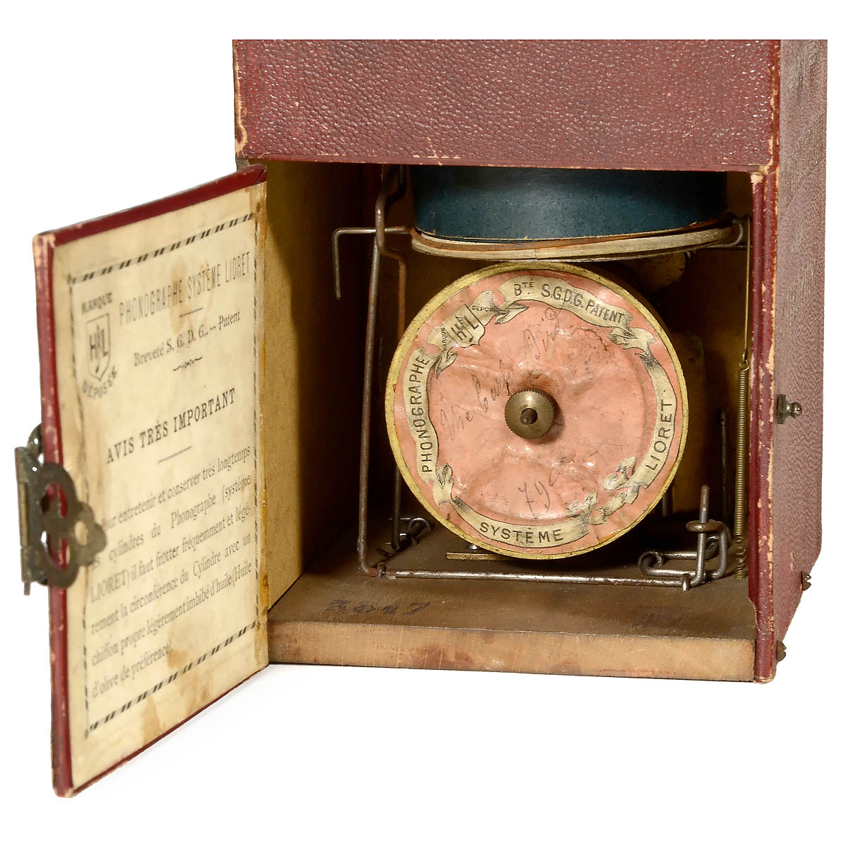Model 1, no. 3817, by Henry Lioret, Paris. For 30-second celluloid cylinders, 1 included, spring motor, card case with burgundy red leather-like covering, top and side openings, French instruction label, height 7 ½ in., working.