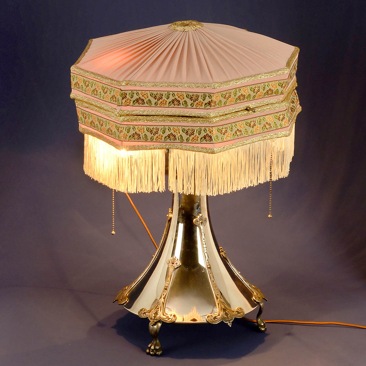 The wedding of the lamp and the phonograph by Burns-Pollock Electrical Mfg. Co, Indiana Harbor IN/USA. U.S. patents 1919, 110 V, with two decorative lamps, replaced, nickeled metal base with Art-Nouveau decoration and three claw feet, height 28 1/3 in. Working perfectly! - The non-plus-ultra of any gramophone collection! Fascinating and highly impressive item of museum quality!