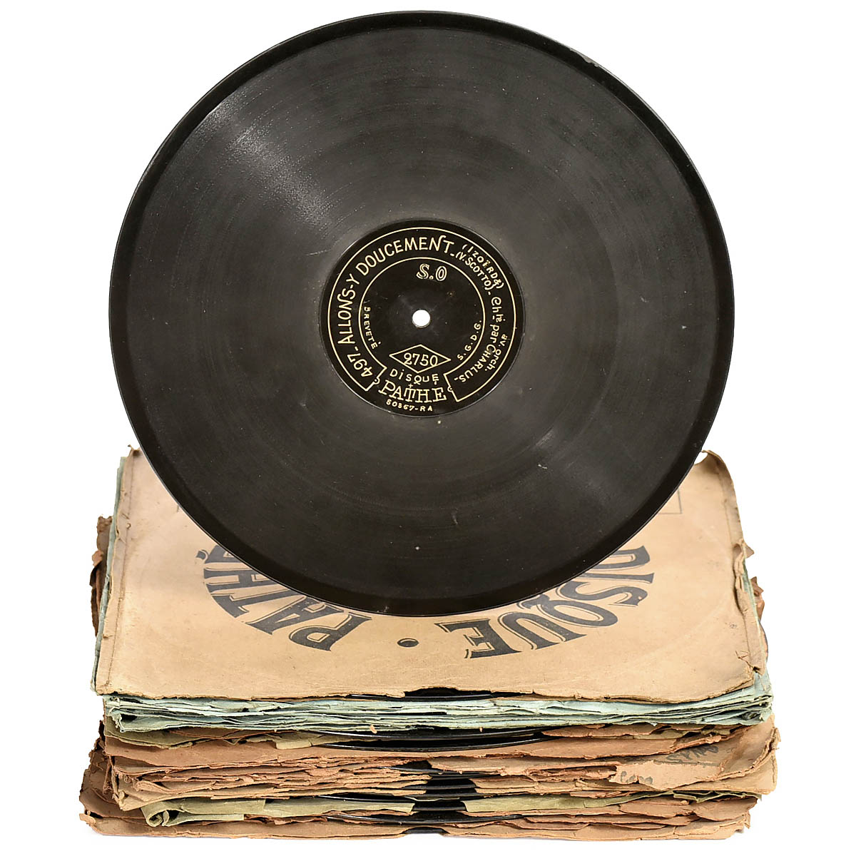 For vertically-cut discs, with additional pick-up arm for horn loudspeakers, lid with adjustable blades for the volume control, working, with 21 Pathé discs.