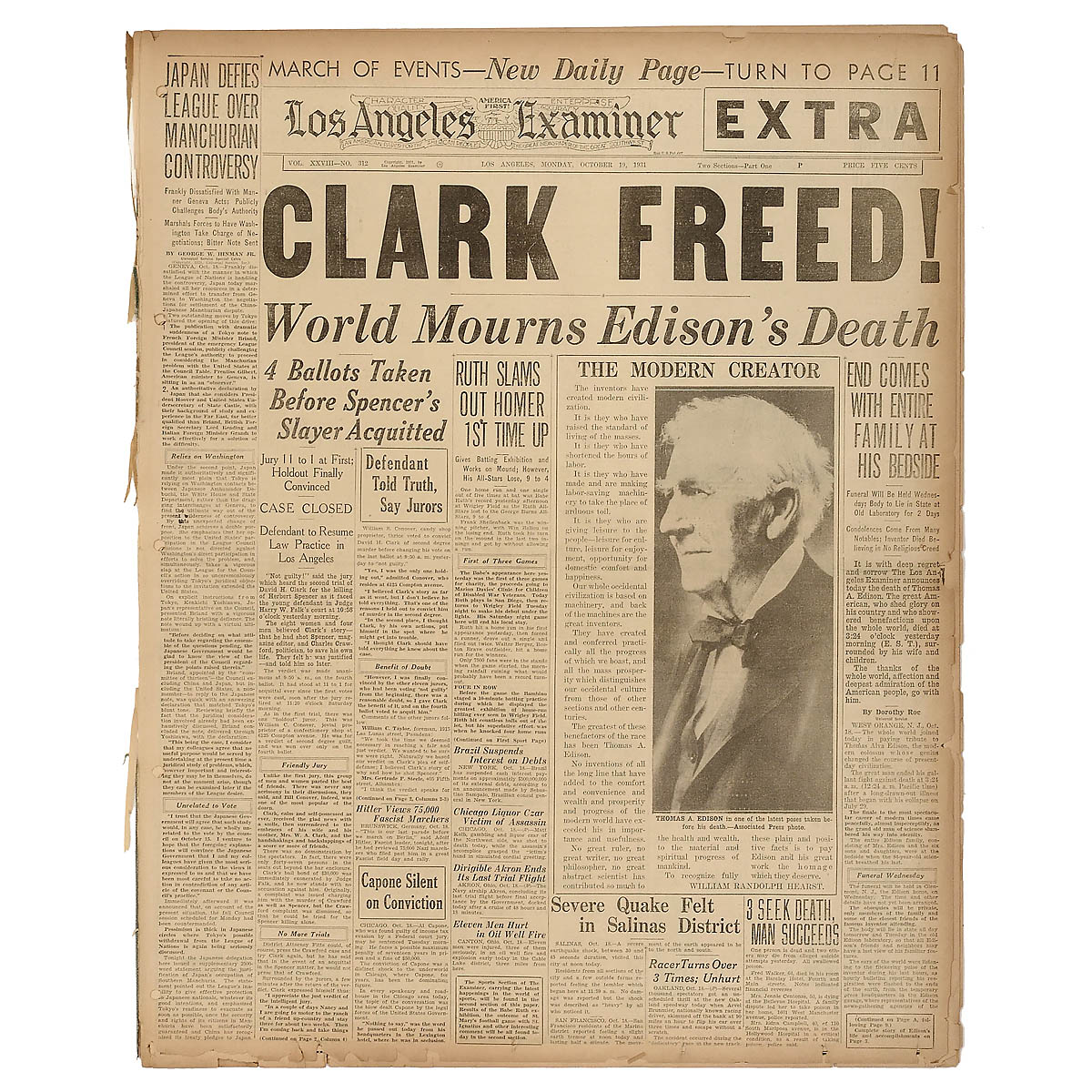 "Los Angeles Examiner", Monday, October 19, 1931, front page and two-sided report, in purpose-built display case.
