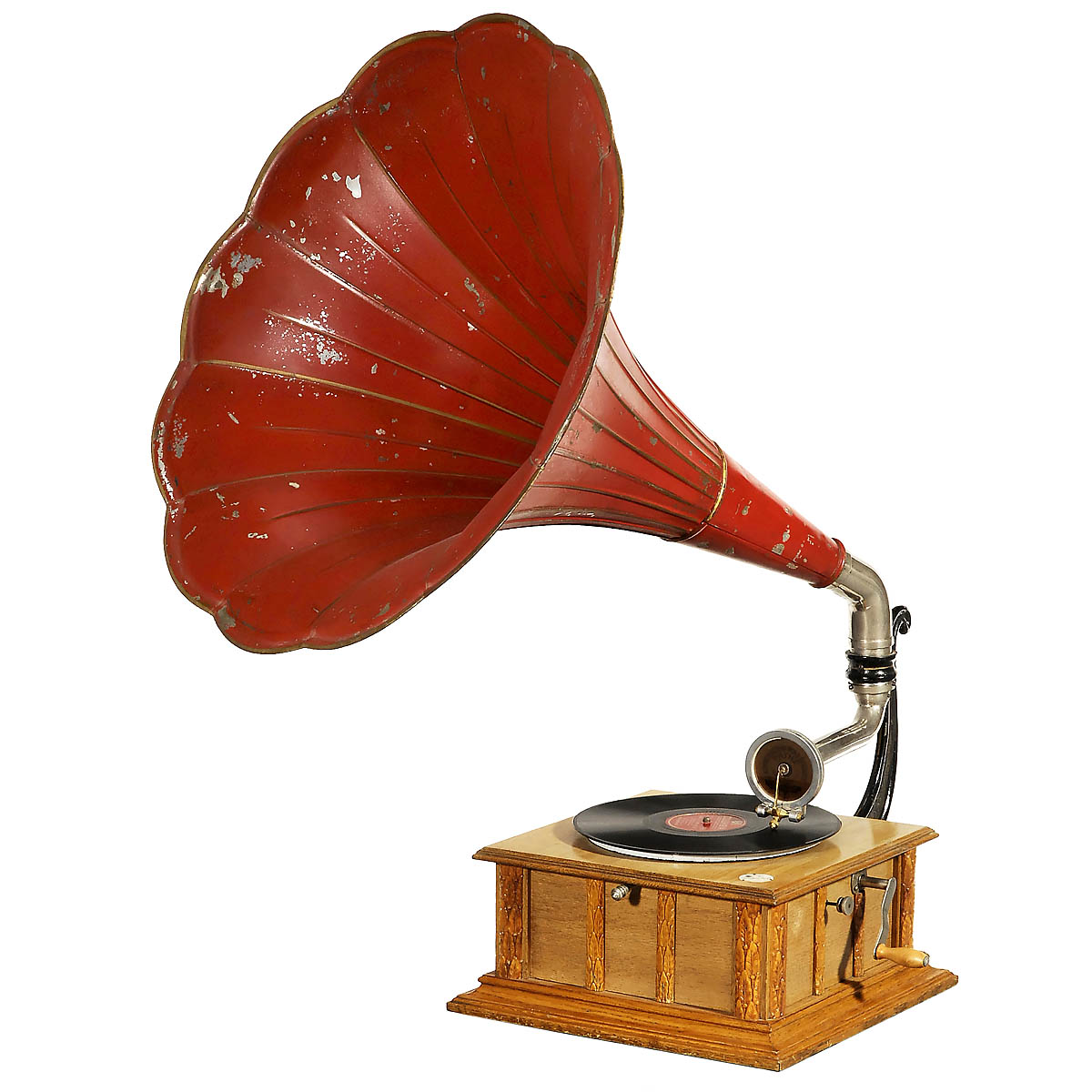Pathé, Paris. For vertically-cut discs, Pathé reproducer, light wood case and painted flower horn, good working condition.