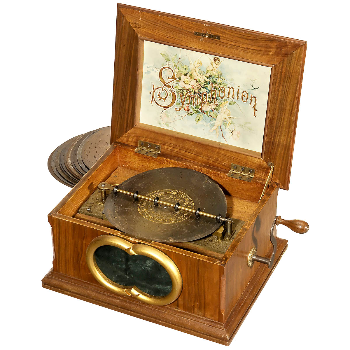 Symphonion Musikwerke, Leipzig. 72 teeth in duplex comb (complete), walnut case, front modified, working but needs adjustment, with 12 discs. - In addition: Sym-phonion No. 2N, for 8 ¼ in. discs, 60 teeth (complete), motor defective, with 6 discs.