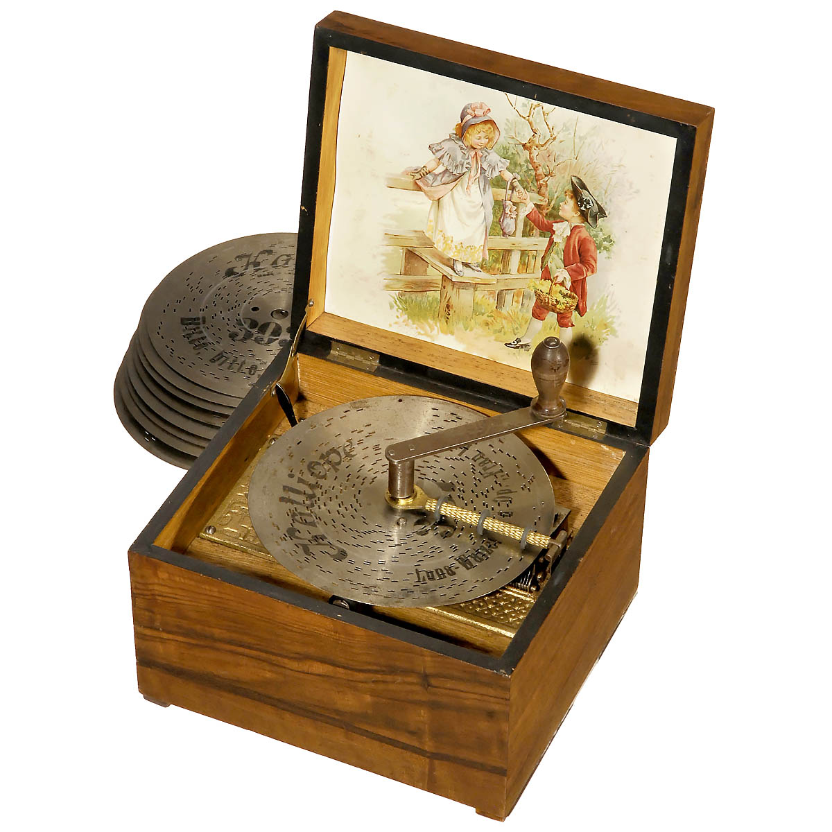 Kalliope Musikwerke, Leipzig. For 7-inch discs, 36 teeth in music comb (complete), crank-wound center turntable, good playing condition, with 9 discs.