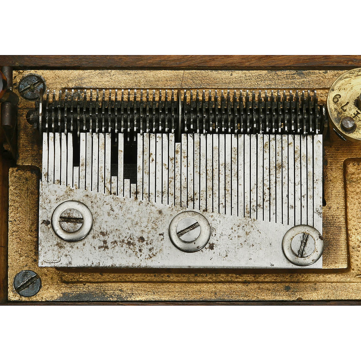 No. 44, Troubadour Musikwerke B. Grosz & Co., Leipzig. For 87/8-inch discs, 44 teeth in steel comb (4 broken), spring-driven, with 6 discs.