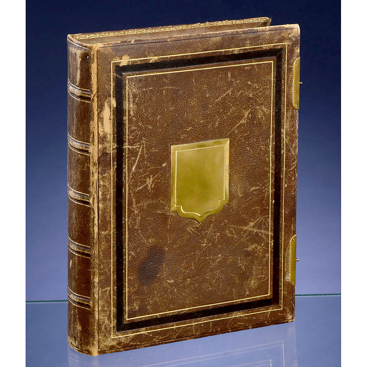 Retailed by Ami Rivenc, with gilt-tooled leather binding, twelve embossed double-sided pages for carte-de-visite photographs and other sizes (several included), tune-sheet and plaque of "Ami Rivenc, Fabricant à Genève", the back page with glazed automaton scene of a tissue-paper sea with three-masted clipper, cliffs, windmill and painted coastline, with two-air cylinder movement playing "Il Baccio, Valse" and "Guillaume Tell, Prière", as the waves roll, the ship heaves and the windmill sails turn, 9 ¼ x 12 in. (23,5 x 31 cm). With key. - Good original working condition. - References: For a similar automaton scene in a sewing necessaire, see Auction Team Breker, 28 May 2011 (Lot 453). - A highly unusual automaton album, the only example of its kind that we have seen to date.