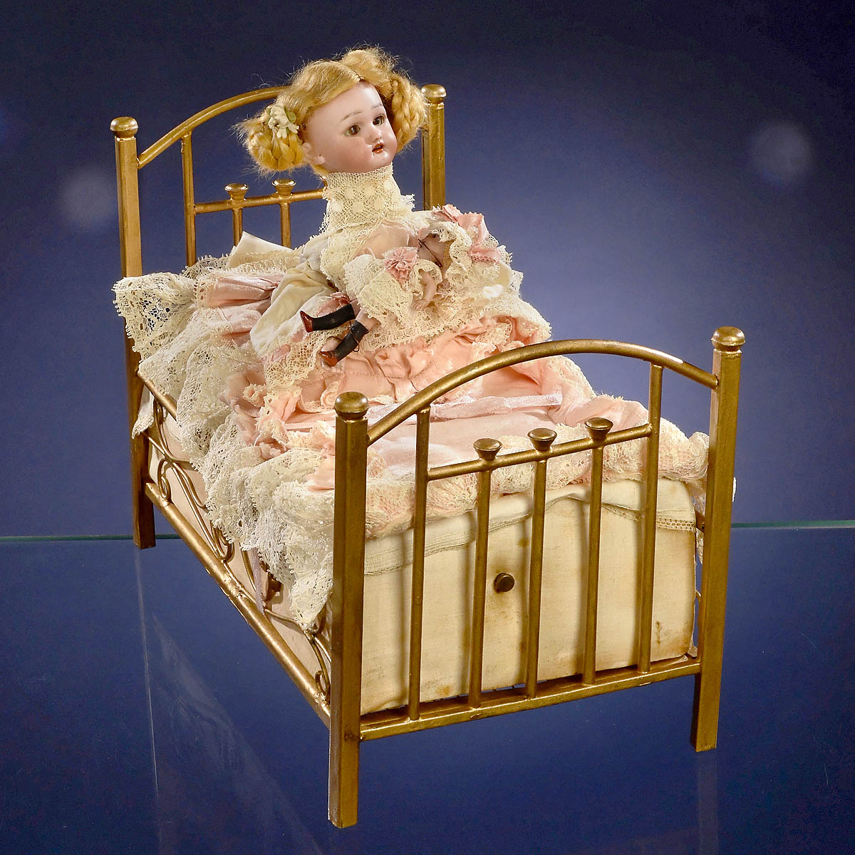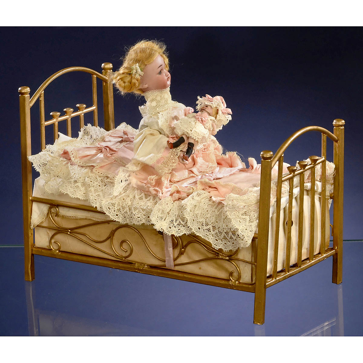 No. 4041, with German bisque head, probably by Simon & Halbig, open mouth, weighted brown glass eyes, pierced ears, original gold mohair wig, bisque hands and all-bisque mignonette baby with glass eyes, with original lace-edged costumes and bed covering, the painted metal bed containing open-spring motor and single-air cylinder musical movement. Height 9 ½ in., width 13 ½ in., depth 7 ½ in. (24 x 24.5 x 19 cm). Beautifully preserved in maker's card box with green paper edging, lid (one flap loose) and label: "1 St. No. 441, Puppenbett, Dpu 81. Made in Austria". - The mother sits up in bed, cradles her baby in her arms, moves her head as though singing a lullaby and then sinks back onto her pillow and closes her eyes, exhausted but still rocking the baby! - An unusual automaton, with charming, realistic motions. Near-mint original working condition.
