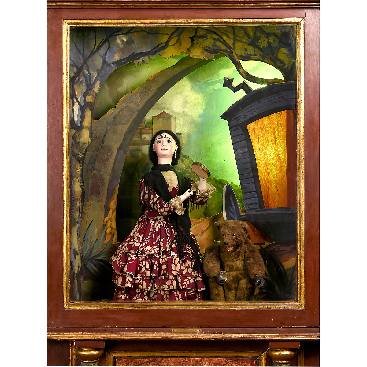 Depicting a gypsy in a shadowy forest clearing. With fine Jumeau bisque portrait head (with artist mark "H3") modelled as an adult woman with classical profile, closed mouth with pronounced cupid's bow, defined philtrum, aquiline nose, fixed blue paperweight eyes and applied pierced ears, bisque hands, papier-mâché body and original non-operative going-barrel clockwork motor. - Beside the gypsy sits a fur-covered drinking bear with articulated head, right arm and mouth. The figures are driven by an electric motor housed in marbled wood cabinet with glazed upper section and paneled base, gypsy approx. 26 ½ in. (67 cm), cabinet: approx. ht. 77 ½ x wd. 37 ½ x dp. 25 in. (197 x 94 x 63,5 cm), wig not removed, minor flake on left ear-piercing hole. - While the bear lifts his glass and tips back his head to drink, the gypsy turns and inclines her head, raises the tambourine and twists her right hand. The exceptional bisque portrait head by Jumeau is seen on a small number of Roullet et Decamps automata produced during the 1880s. Other automata with the same head mould include the 'Magicienne', 'Pifferari' and Vichy's 'Violin Concerto'. A rare and visually impressive automaton with a particularly beautiful expression. - Provenance: Former collection of Atracciones Apolo, an indoor amusement park opened by Josep Vallés Rovira on Parallel Avenue, Barcelona, in 1935. One of the park's most famous attractions was the Museo las Maravillosas Figuras en sus Dioramas (Museum of Marvellous Figures in their Dioramas), a collection of 19th century French automata in fantasy settings designed and painted by the artist Martí Llauradó. - According to an article published by Edición del Domingo on 19 August 1990, the Apolo's automata museum closed in 1957. The automata were stored, forgotten, for almost fifty years until acquired by the Museum of Toys and Automata in Verdú. - References: "A Great and Magical Collection", museum catalogue, pp. 313-325; Ròmul Brotons, "Parcs d'Atracciones de Barcelona", pp. 143-147; Auction Team Breker, 7. November 2015, Lot 628 and 5. November 2016, Lot 530 for other Apolo automata from the series.