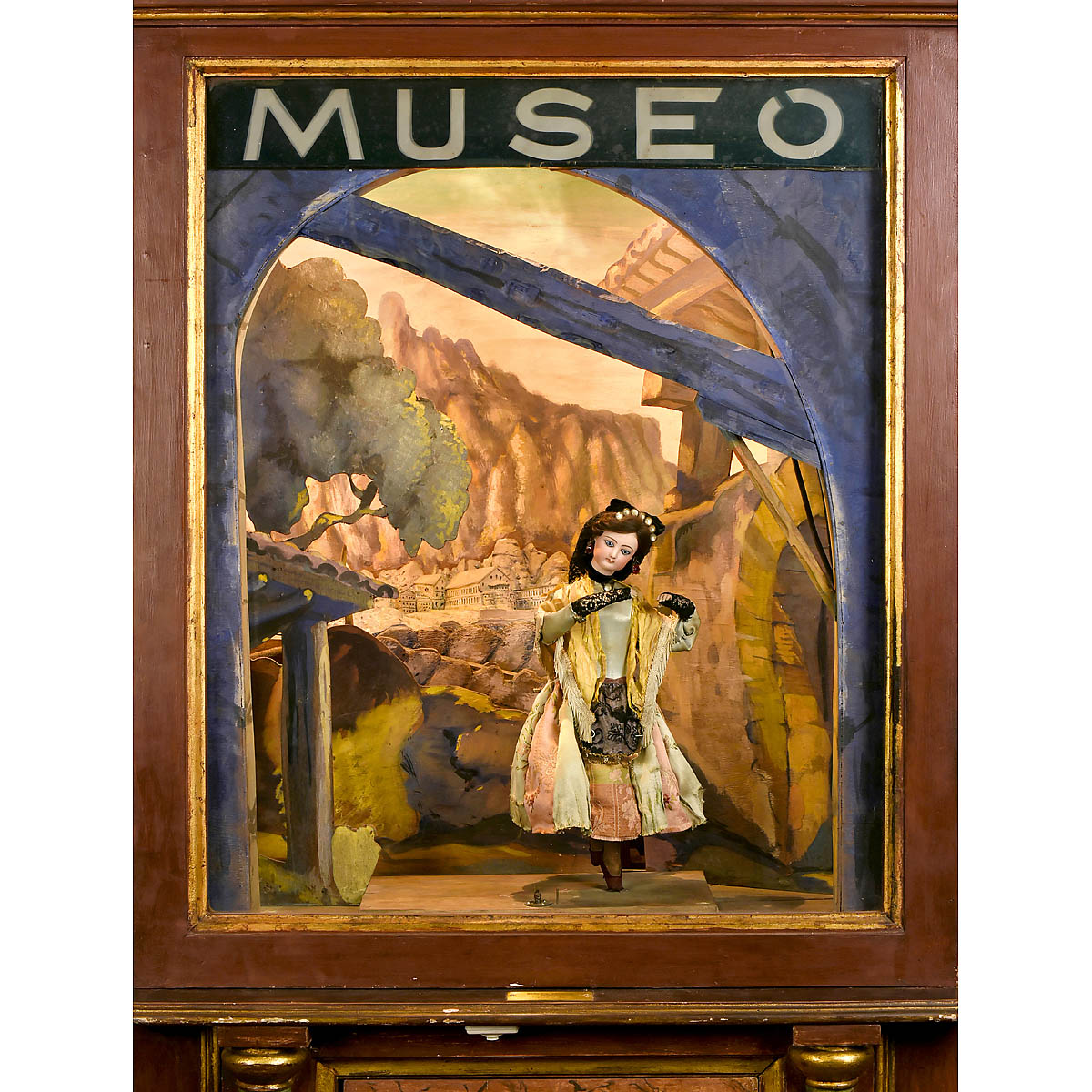 Depicting a dancer in a rocky Catalan landscape, a monastery on the crest of a hill and traditional stone buildings with painted beams in the foreground. The dancer with unmarked bisque head by François Gaultier, closed mouth, fixed light-blue eyes outlined in dark-blue, pierced ears, bisque hands, polychrome satin skirt, silk shawl and black lace mantilla. Her shapely papier-mâché body contains the original working going-barrel clockwork motor that causes the figure to tilt her head gracefully, twist her left arm and kick her right leg. A separate electric motor causes her to rotate. - In marbled wood cabinet with glazed upper section and paneled base, figure approx. 18 ½ in. (47 cm), cabinet: approx. ht. 80 x wd. 37 ½ x dp. 25 in. (202 x 94 x 63,5 cm), unobtrusive chip on left eye rim, small section missing from nape of neck - covered by the wig. - Provenance: Former collection of Atracciones Apolo, an indoor amusement park opened by Josep Vallés Rovira on Parallel Avenue, Barcelona, in 1935. One of the park's most famous attractions was the Museo las Maravillosas Figuras en sus Dioramas (Museum of Marvellous Figures in their Dioramas), a collection of 19th century French automata in fantasy settings designed and painted by the artist Martí Llauradó. - According to an article published by Edición del Domingo on 19 August 1990, the Apolo's automata museum closed in 1957. The automata were stored, forgotten, for almost fifty years until acquired by the Museum of Toys and Automata in Verdú. A rare and historic piece from one of Spain's oldest amusement parks.- References: "A Great and Magical Collection", museum catalogue, pp. 313-325; Ròmul Brotons, "Parcs d'Atracciones de Barcelona", pp. 143-147; Auction Team Breker, 7. November 2015, Lot 628 and 5. November 2016, Lot 530 for other Apolo automata from the series.