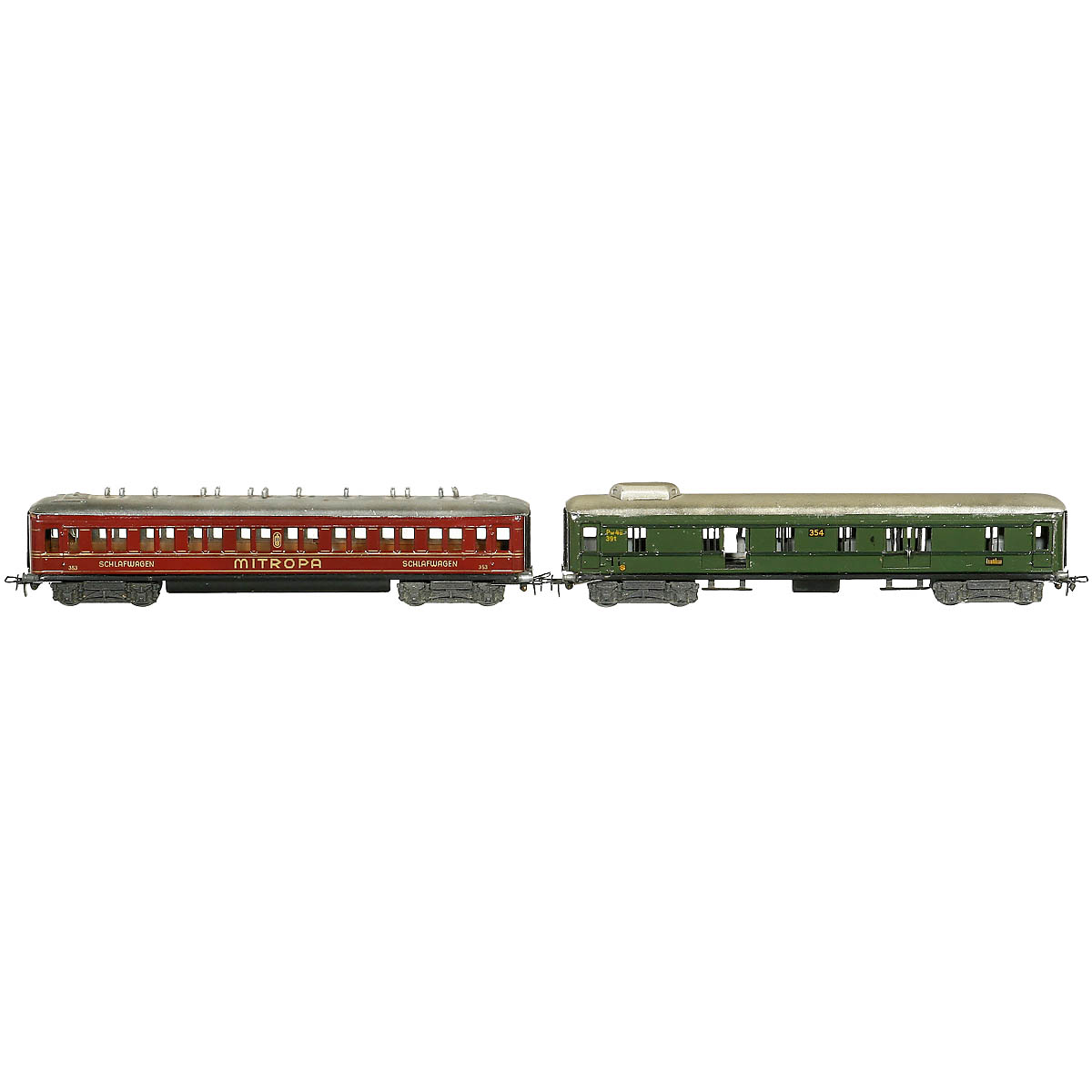 Gauge 00/H0, tin, length each 8 4/5 in. 1) Fast train baggage car 354, large cast-metal bogies, 4 double sliding doors. - And: 2) Mitropa sleeping car 353, missing some ventilation pipes, gilt lettering on end faces.