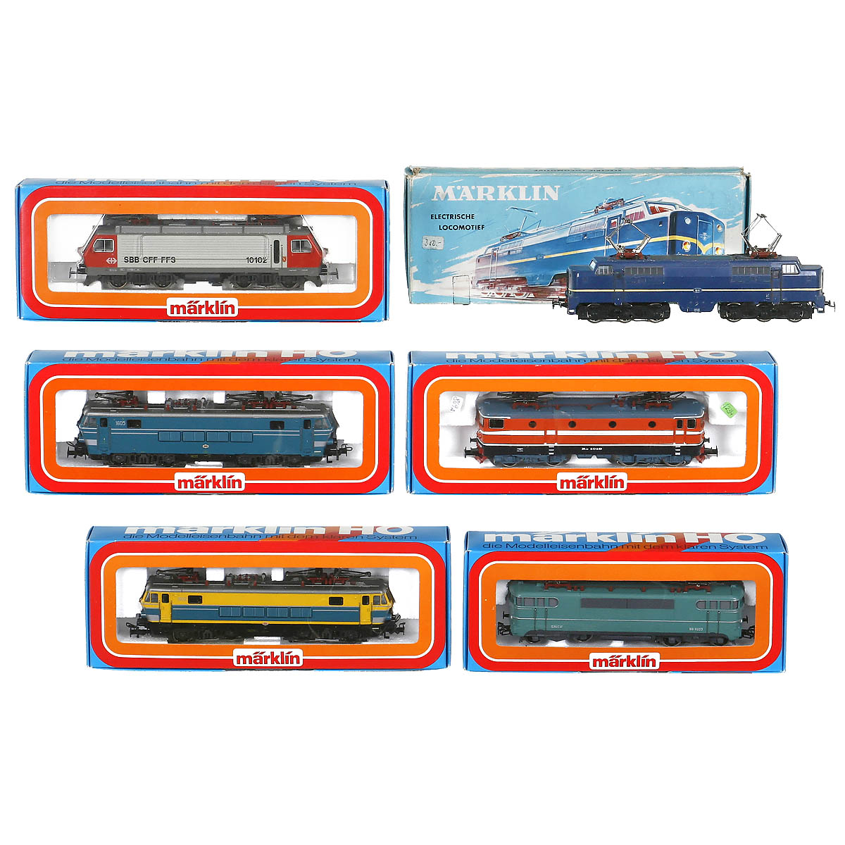 Gauge H0. 1) 3051, series 1200 NS. - 2) 3043, series Rc SJ. - 3) 3038, series 9200 SNCF. - 4) 3323, series Re 4/4 SBB. - 5) 3152, series 16 SNCB, blue. - And: 6) 3163, series 16 SNCB, yellow/blue. - All locomotives in original boxes.