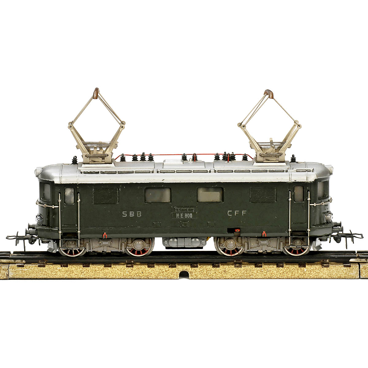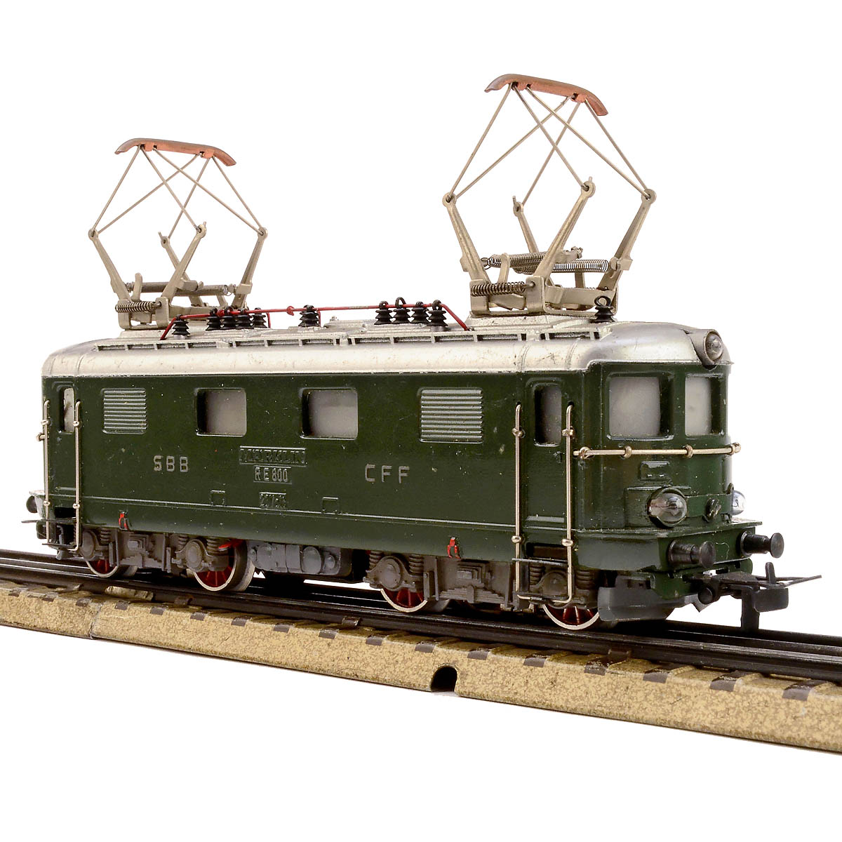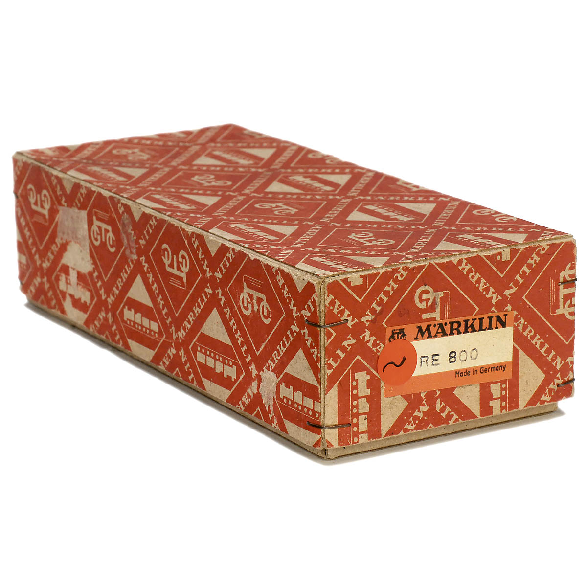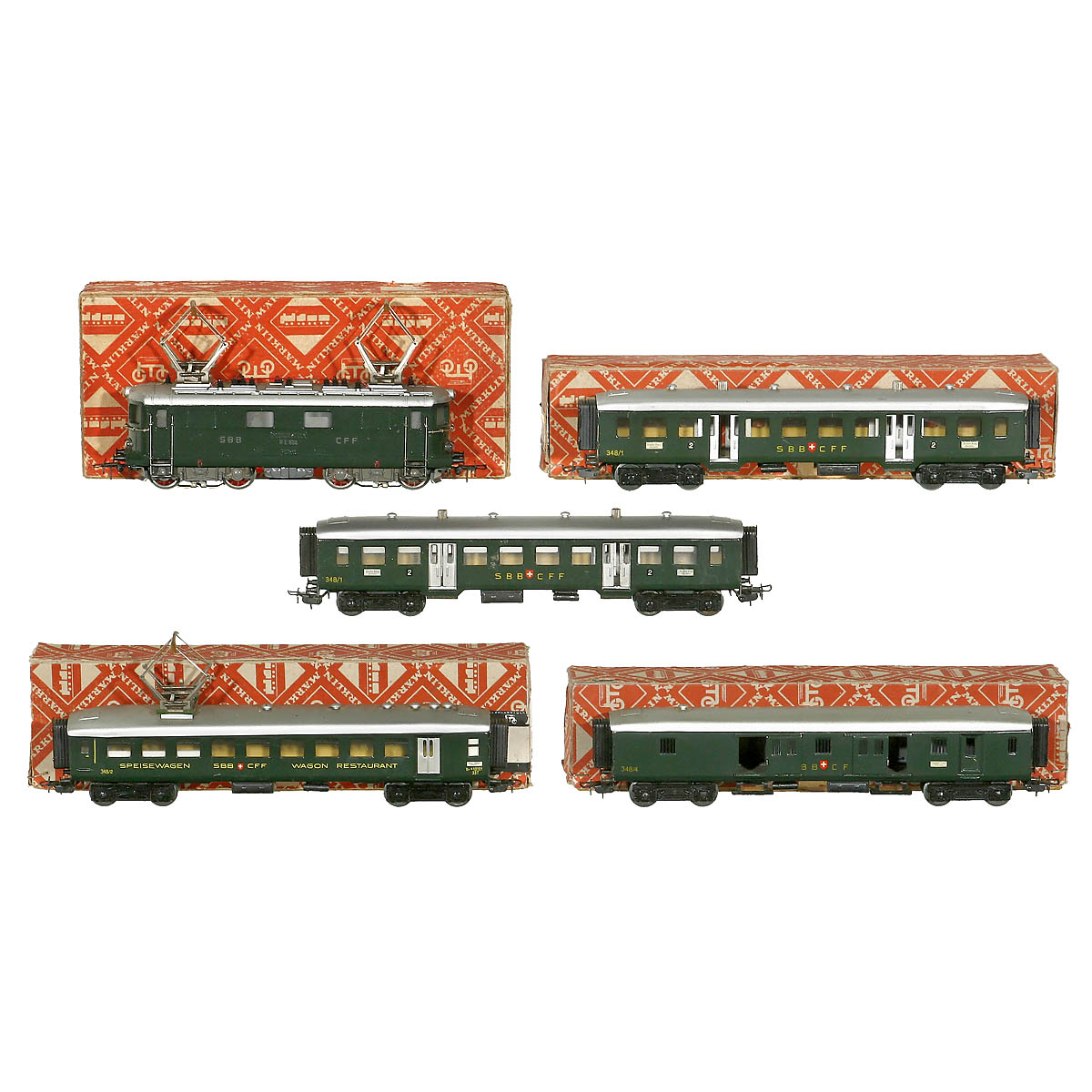 H0. 1) RE 800 electric locomotive, version 2, cast metal, 6 headlights, length 6 ½ in., in original box. - 2) Passenger car 348/1, version 4. - 3) Passenger car 348/1, version 2, with original box. - 4) Dining car 348/2, version 4, with original box (missing back). - And: 5) Baggage car, version 2, with original box. - Length of the cars 8 ¼ in. each.