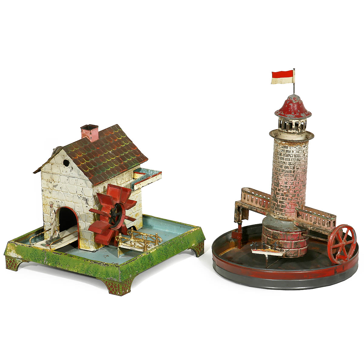 1) Lighthouse with revolving boat, Ø 7 ¼ in., height 10 1/5 in. - And: 2) Watermill with pump station, 7 ¼ x 7 ¼ in.