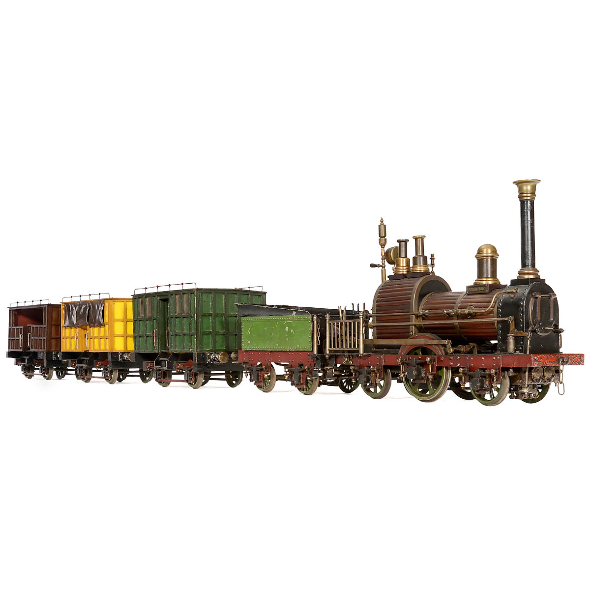 A finely engineered model with coal-fired wood-planked flame-tube boiler, 2 cylinders under the boiler, reversible, speed regulator, steam whistle, manometer, spring-loaded axles, tender with water tank, length 28 in. - And: 3 matching passenger cars with wooden superstructure. - With her sister locomotive "De Arend", "Snelheid" pulled the first train between Amsterdam and Harlem on the first Dutch railway of 1839.