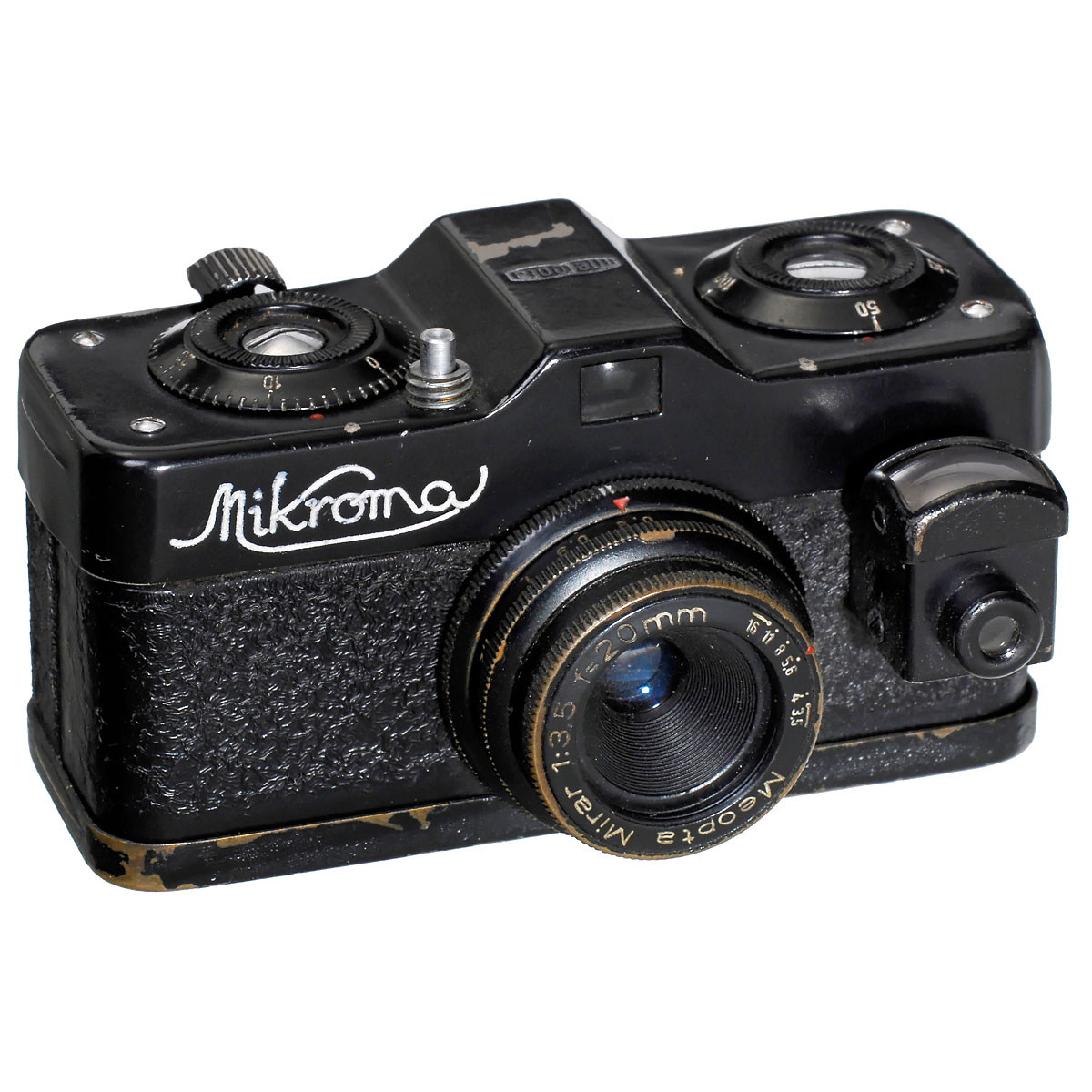 Meopta Prerov, Czechoslovakia. Size 11 x 14 mm on 16mm film, Mirar 3,5/20 mm, shutter 1/5-1/400 sec., black body. Besides the normal eye-level finder on top, there is a waist-level brilliant finder mounted on the front. Made for the Czechoslovakian police. - Rare!