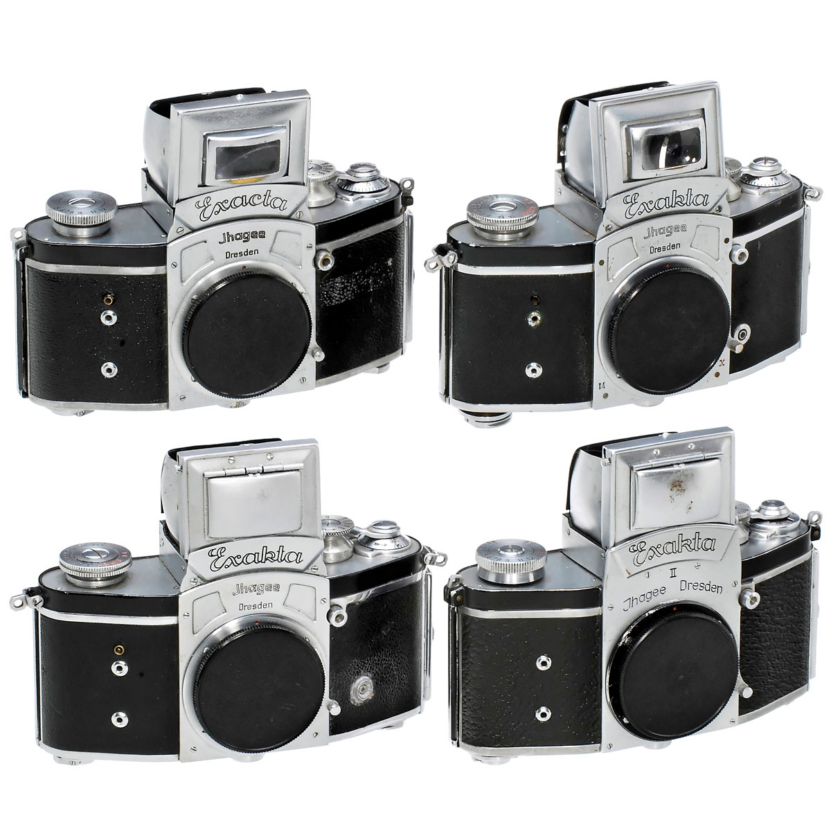 Ihagee, Dresden. 1) Kine Exakta I, version 4, no. 558398, shutter curtain wavy, delayed-action release and shutter time 1/10 sec. (3/3) - 2) Kine Exacta I, version 4, no. 632655, delayed-action release and shutter time 1/5 sec. (3+/3+) - 3) Kine Exakta I, version 4, rectangular magnifier with cover cap from Kine Exakta II, c. 1945, no. 611312, synchronized later. (3-/3+) - And: 4) Kine Exakta II, version 2, no. 662960. (3/2)