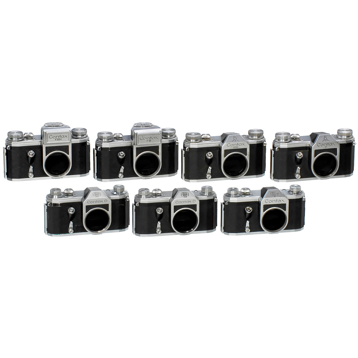 VEB Zeiss Ikon, Dresden. 1) Contax S (version "D-2"), no. 44301, 4/1951-12/1951, version with self-timer. (2/2) - 2) Contax D (large "D"), 1952, "Zeiss Ikon VEB" logo, in bold script, no. 148322. (2/3) - 3) Contax D (large "D"), 1952, "Zeiss Ikon VEB" logo, in fine script, no. 5008500. (3/3) - 4) Contax F, 1956, "Ernemann Tower" logo, no. 403017. (3-2/3) - 5) Contax FB, 1956, built-in light meter, working, no. 5048884. (3/3) - 6) Contax FM, 1958, "Ernemann Tower" logo no. 5087599. (3/5) - 7) Contax FBM, 1958, built-in light meter (working), no. 477666, export version. (2-/2-) - Literature: Alexander Schulz, "A History of the World's First 35 mm Prism SLR Camera" and Richard Hummel, "Spiegelreflexkameras aus Dresden".