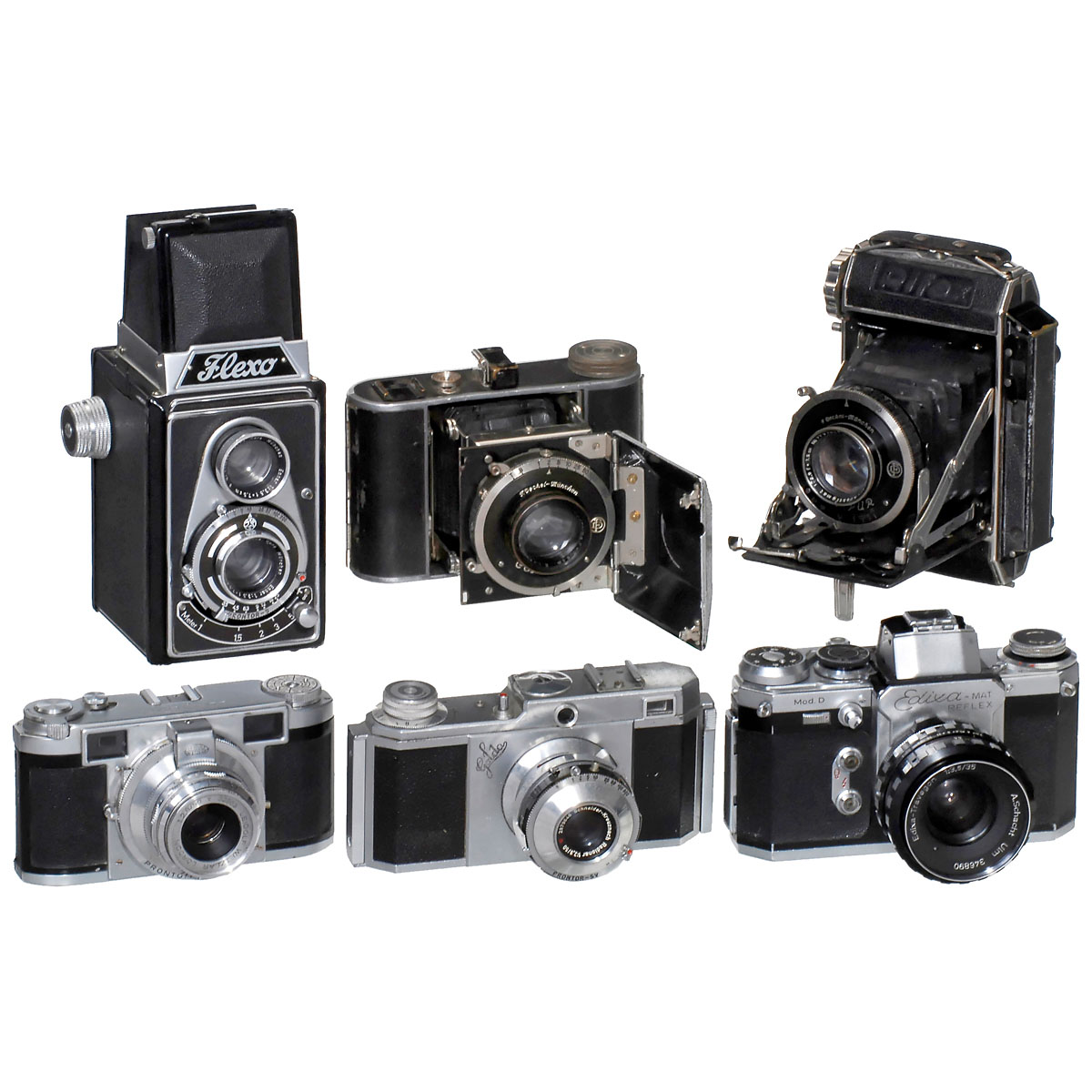 1) Beier, Freital. Rifax 6 x 6 8 (rangefinder model), c. 1937, coupled rangefinder, Rodenstock Trinar 2,9/7,5 cm, Compur shutter (uneven). (3/4) - 2) Kochmann, Dresden. Korelle 4,5 x 6 cm, 1933, Ernoldar 2,9/7,5 cm in Compur (uneven), viewfinder glass with crack. (3/4) - 3) Lippische Camerafabrik, Barntrup. Flexo, c. 1949, 6x6-TLR camera, Ennar 3,5/7,5 cm in Prontor-S, long shutter speeds stuck. (2/3-) - 4) Goldammer, Frankfurt. Golda, c. 1949, first model, Radionar 2,9/50 mm in Prontor-SV. (2-3/2) - 5) Leidolf, Wetzlar. Lordomat, 1953, Lordon 2,8/50 mm in Prontor-SVS, rangefinder stuck. (2/3-4) - And: 6) Wirgin, Wiesbaden. Edixa-Mat Reflex Mod. D, 1966, Edixa-Travegon 3,5/35 mm. (3/3)