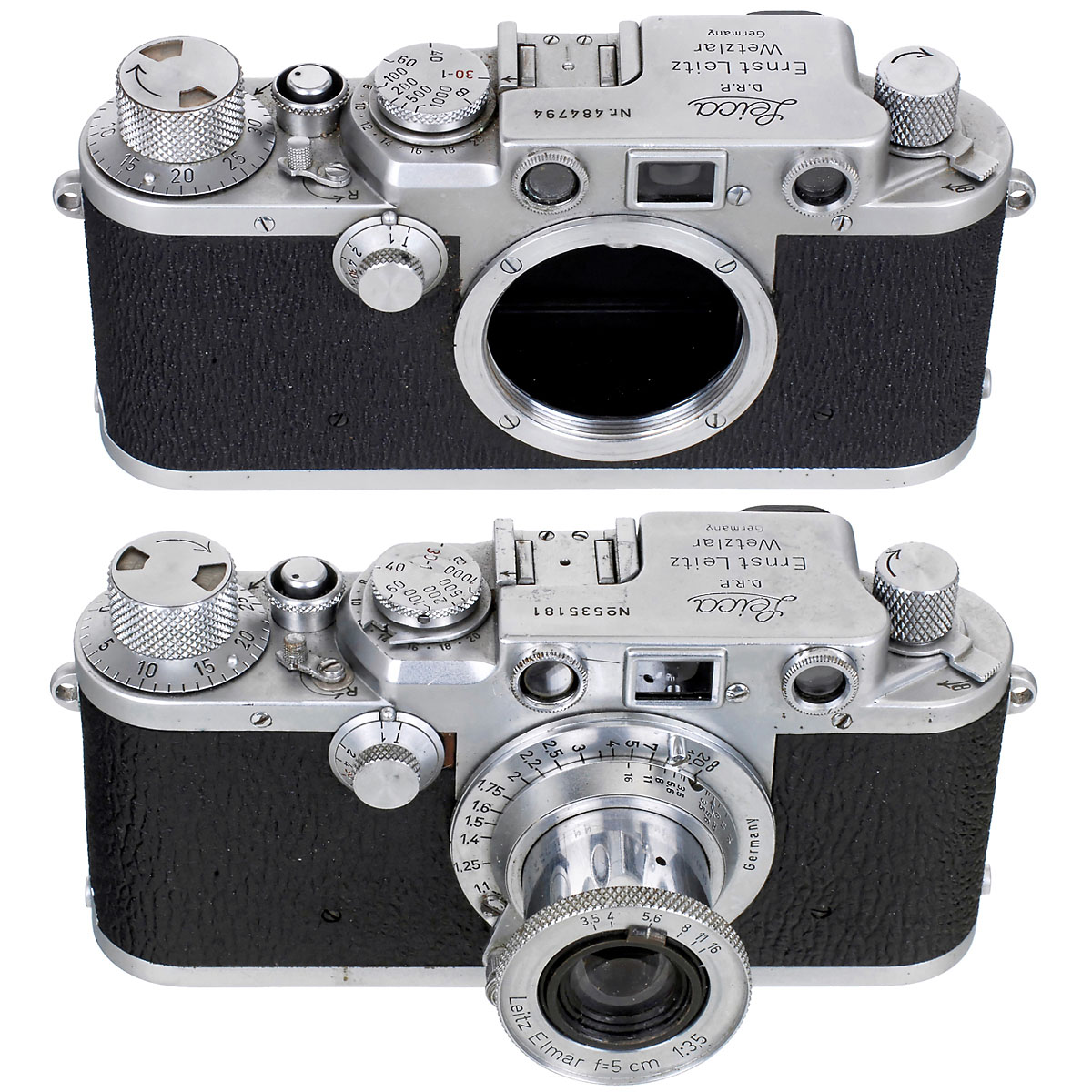 Leitz, Wetzlar. 1) Leica IIIc, converted to IIIf, no. 484794, 1949. "Sharkskin" vulcanite, black-dial synchronization. Good technical condition. (2-3/2) - And: 2) Leica IIIf, no. 535181, 1950. Black-dial synchronization, Elmar 3,5/5 cm, no. 640428, meter scale. (3/3)