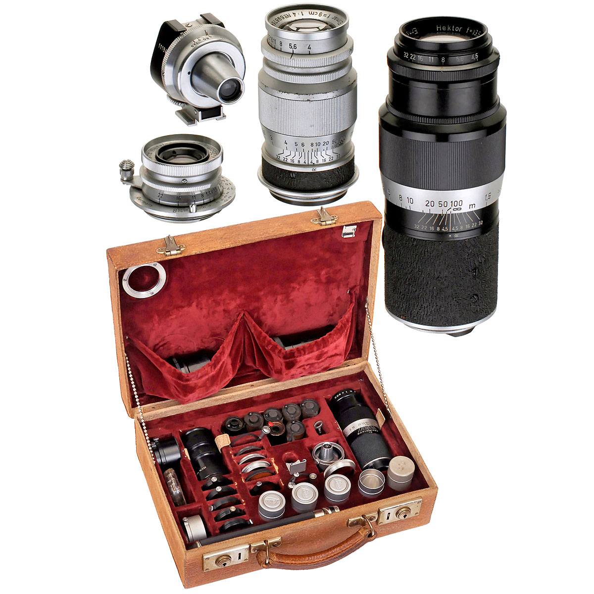 Leitz, Wetzlar. 1) Summaron 3,5/3,5 cm, no. 712698, meter scale, bakelite container. (2/2) - 2) Elmar 4/9 cm, no. 698764, meter scale, bakelite container. (3/2-) - 3) Hektor 4,5/13,5 cm, black/chrome, meter scale, tripod socket. (2/3) - And: 4) Accessories: universal viewfinder VIOOH (with straight sides), no. 11194, lens hoods for Elmar 5 cm (N.Y.!), Summaron-Elmar 3,5 cm, FIKUS 5-13,5 cm. connection rings "Summar-Elmar 5 cm" (M 1:1,5/1:2/1:3). 9 filters 36A, 9 film cassettes and more. - All accessories in a leather case.