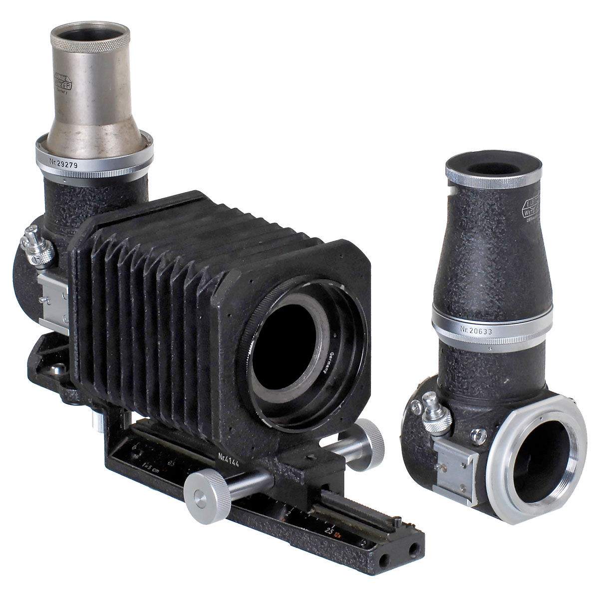Leitz, Wetzlar. 1) Visoflex I, M version OZXOM, 5x magnifier LVFOO, 2 caps. (2/2) - And: 2) Visoflex I, M version OZXOM, with 5x magnifier LGCOO (bright version), with bellows I UXOOR (tight). (2/3)
